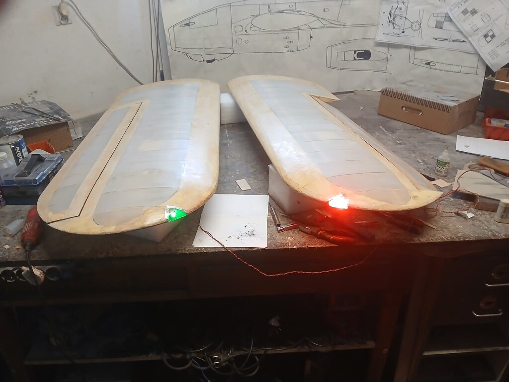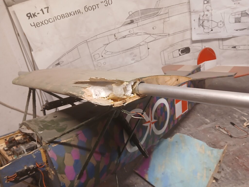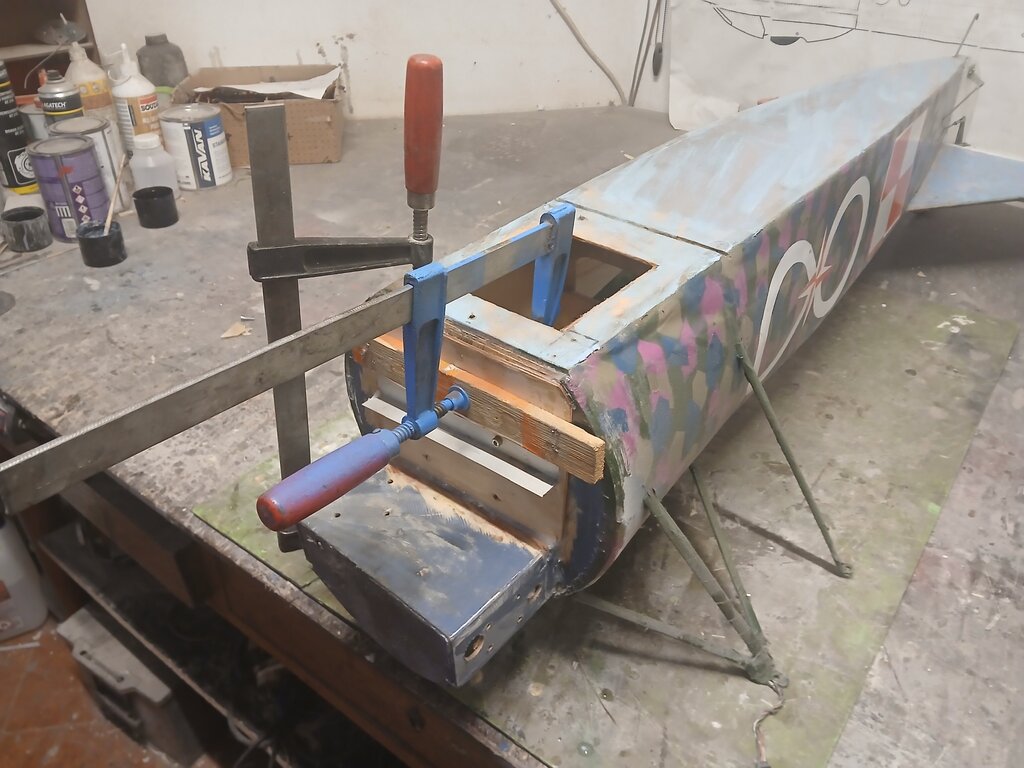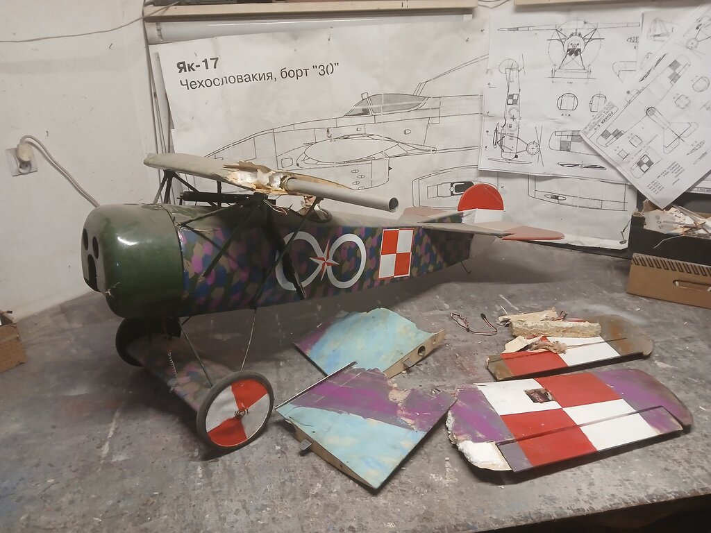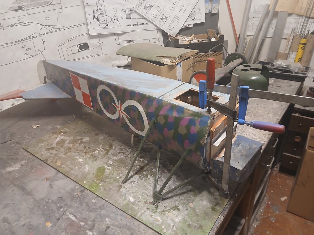 Witam Parę osób kojarzy Mojego Fokkerka ,dla Tych co nie kojarzą wygląda tak 😃 A lata tak 😃 Ale pewnego razu stwierdziłem że wygląda mało makietowo i trzeba coś z tym zrobić .Wpadło Mi w ręce zdjęcie które stało się inspiracją do dalszych prac nad Fokkerkiem oto to zdjęcie . Jak zobaczyłem tak zrobiłem Fokkerek teraz wygląda tak 😃 Troszkę nie dokładnie ale starałem się jak mogłem 😄 A tak na poważnie to pewnego dnia zaliczyłem "cyrkiel " którego efektem było odklejenie poszycia od rdzenia na jednym skrzydle ,trudno trzeba było naprawić . Zastosowałem "zastrzyki " z kleju i wydawało się że poszycie trzyma ,przynajmniej kilkanaście lotów . Feralnego lotu po wykonaniu kilku "fikołków " zauważyłem że model zaczął dziwnie reagować na stery , no to lądujemy ale model miał inne plany , przy dolocie do pasa na wysokości około 30-35m nad lasem zrobił " motylka " i pionowo w dół zmierzał ku ziemi ale na przeszkodzie stanęły drzewa co go zatrzymało niecałe 2 m nad nią 😀 Straty wyrwana wręga silnikowa ( zrobiona z sklejki 6mm z OBI ) centralnie silnikiem wbił się w gałąź oraz skrzydła Po odczekaniu swojego czas go naprawić bo to fajne a nawet bardzo fajne latadło . Zaczynamy od kadłuba , wyłamana wręga silnikowa została wycięta . dorobiłem ze sklejki 2mm 6mm i 3mm wręgi naprawcze co by zalatać powstałą dziurę wszystko posklejane na żywicę poszło do schnięcia Rdzenie na płaty wyciąłem już jakiś czas temu. CDN