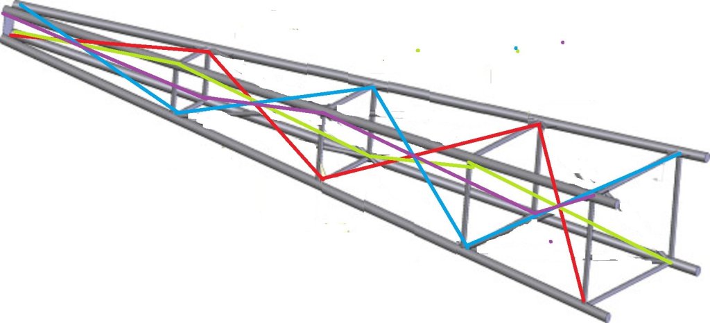 5. Potrzebujesz czterech linek . Pierwszą zaczynasz w dolnym prawym rogu tam gdzie kończy się sklejkowy bok kadłuba i ciągniesz do górnego lewego połączenia podłużnic z pierwszym słupkiem następnie znowu prawy dół i tak dalej do końca kadłuba . Druga zaczynasz w lewym dolnym do górnego prawego. Trzecia zaczynasz w Prawym górnym do lewego dolnego Czwarta zaczynasz w lewym górnym dp prawego dolnego Ja owijam linką wokół połączenia podłużnic z poprzeczkami a dodatkowo czwartą linkę w miejscu spotkania wszystkich linek na środku kadłuba owijam wszystkie linki razem , dodatkowo połączenia linek z podłożnicami zalewam CA ( linki wystają z obrysu podłużnic dlatego później naklejam na podłużnice paski balsy 0,8mm co by to jakoś wyglądało ) Przy napinaniu linek uważaj aby nie zrobić banana z kadłuba oraz żeby linki nie były luźne .