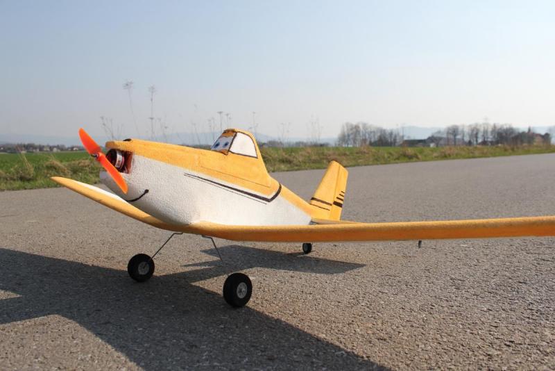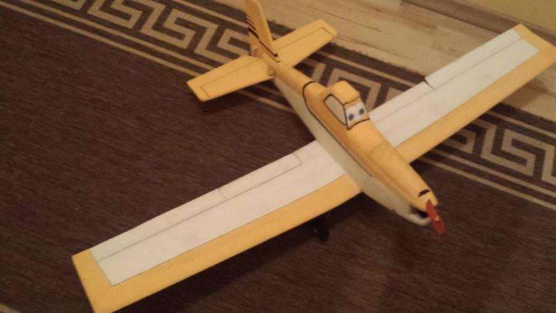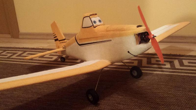Dawno nie udzielałem się na tym forum gdyż wciągnęło mnie latanie quadrocopterem, ale za namową naszego kolegi z forum Marka R. stałem się posiadaczem bajkowego samolotu DUSTY. Nie wiem czy choć by część forumowiczów oglądało ten film, ale ja mam syna 11 letniego więc można powiedzieć ze musiałem go oglądnąć. Na stare lata człowiek dzecinnieje Model jest bardzo prosty i bezproblemowy w montażu, wykonany oczywiście jak wszystkie modele od Marka z pianki EPP. rozpiętość 1.2m długość 67cm więc jest dość krótki coś jak PZL Dromader. Kadłub jest bardzo wysoki miałem obawy co do wyważenia i stabilności lotu. W niedziele wykonałem pierwszy oblot modelu jeszcze nie pomalowanego. Niestety Koledzy modelarze nie dopisali i oblot przeprowadzić musiałem bez kamery i świadków. Pierwszy lot odbył się przy lekkim wietrze i był dość nie stabilny, model wymagał trymowania. Przy drugim locie już po ustawieniu byłem w totalnym szoku, model przepięknie lata jest bardzo stabilny może nim sterować nawet dziecko. Udało się tak go ustawić ze położyłem aparaturę na ziemi i przez jakieś 2-3 minuty korygując tylko raz ster kierunku (bo wiatr go spychał), majestatycznie latał nad głową zataczając duże kręgi. DUSTYm latałem kilkanaście minut sterując wyłącznie kierunkiem, nie ruszając ani lotkami ani gazem który miałem ustawiony na jakieś 40% mocy. Po kilku lotach postanowiłem zmienić pakiet na nowy (2200) I tu nastąpiło wielkie zaskoczenie gdyż na nowym pakiecie przy bardzo spokojnym locie, gdzie o jakiejkolwiek termice nie było mowy, unosił się w powietrzu 40 minut . Teraz czekam tylko na pogodę i jakiegoś operatora filmowego Wiem ze Marek wyciął jeszcze 2 takie modele może inni koledzy podzielą się swoimi wrażeniami z lotów pozdrawiam Mariusz