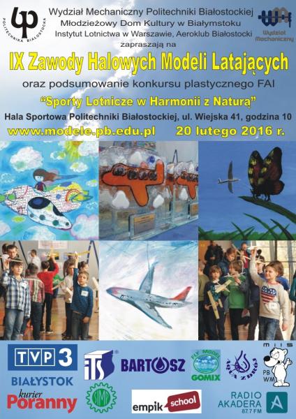 Wydział Mechaniczny Politechniki Białostockiej Młodzieżowy Dom Kultury w Białymstoku Instytut Lotnictwa w Warszawie Aeroklub Białostocki serdecznie zapraszają na IX HALOWE ZAWODY MODELI LATAJACYCH oraz rozstrzygnięcie konkursu plastycznego "Sporty Lotnicze w Harmonii z Naturą" 20.02.2016r. - godzina 10 Hala Sportowa Politechniki Białostockiej, ul. Wiejska 41 Program imprezy: 9.00 - 9.50 - Rejestracja zawodników i trening 10.00 - Uroczyste otwarcie imprezy 10.20 - Podsumowanie konkursu plastycznego 10.40 - Rozpoczęcie zawodów ok. 14.00 - Zakończenie Zawodów Modeli Halowych Wszystkich uczestników zawodów prosimy o zabranie obuwia sportowego i używanie go w trakcie zawodów! W trakcie imprezy przewidziane są m.in. : • wystawa nagrodzonych i wyróżnionych prac konkursu plastycznego • wystawa i pokazy modeli latających zdalnie sterowanych • prezentacja Aeroklubu Białostockiego ---------------------------------------------------------------------------------------------------------------------------- Wymagania techniczne modeli: Kategorie wiekowe dla dzieci: do udziału w tych kategoriach dopuszcza się wyłącznie!!! modele przekazane wcześniej, jako zestawy do montażu, przez organizatorów. Do udziału w zawodach dopuszcza się również modele, które były dostarczone przez organizatorów w ubiegłym roku tzn. "Iskierki". Sklejone modele będą udostępnione przez organizatorów przed rozpoczęciem zawodów. Kategoria "Open": dowolny!!! model spełniający następujące wymagania (wg. przepisów klasy F1N): model halowy szybowca wypuszczany z ręki to model puszczany w pomieszczeniu zamkniętym, bez napędu, w którym siła nośna jest wytwarzana przez siły aerodynamiczne działające na płaty nośne nieruchome względem modelu w locie (tj. powierzchnie, które nie wykonują ruchu obrotowego takiego jak w śmigłowcu, ani ruchu wahadłowego takiego jak w skrzydłowcu). Gotowe modele, w ilości około 100 sztuk, będą udostępnione za darmo dla uczestników zawodów podczas rejestracji w dniu przeprowadzenia zawodów. Dotyczy kategorii wiekowych dla dzieci!!! Rejestracja zawodników będzie przeprowadzana od godziny 9.00. O otrzymaniu modelu decyduje kolejnośść zgłoszenia. Do godziny 10.00 będzie można przeprowadzić regulacje modeli i trening na hali PB. Organizatorzy nie zapewniają modeli do kategorii "OPEN".