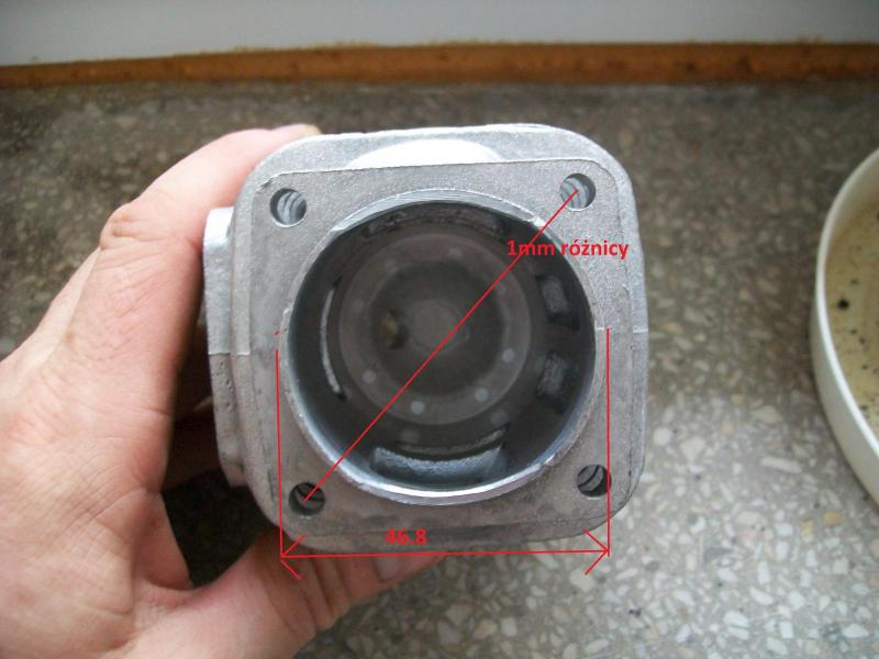 Części przyjechały. Nie jest różowo. Średnica cylindra jest mniejsza od DLE/RCGF. A co za tym idzie kołnierz na cylindrze wchodzi za luźno w karter. Wygląda to tak. Stary kołnierz,śr. zew. 48,2 , nowy cylinder od HP-kołnierz 46,8. Czyli mamy 0,7mm na stronę luzu za dużo. Do tego rozstaw otworów ma różnicę 1mm czyli 0,5 na stronę ale to dałoby się w warunkach domowych wykonać poprzez rozwiercenie otworów. Nie wiem co zrobić z cylindrem żeby siadł na starym karterze? Odciąłem kołnierz ze starego czyli wymiar zewnętrzny bym miał. Tylko teraz potrzebuję zrobić wymiar wew. żeby wcisnąć go na nowy cylinder. Pytanie. Czy jakaś maszyna+człowiek jest wstanie zdjąć z pierścienia grubości ścianki 1,65 1mm tak żeby zostało te 0,65mm ścianki. Podejrzewam,że bez takiej operacji się nie obejdzie bo cylinder musi być wycentrowany w karterze.