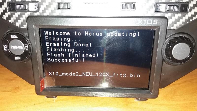 Aby ponowne flashowanie zakończyło się sukcesem muszę ponownie wkleić plik X10_mode2_NEU_1203_frtx.bin do folderu FIRMWARE. Flashuję, operacja kończy się sukcesem. Wyłączam na chwilę nadajnik, po czym włączam ponownie