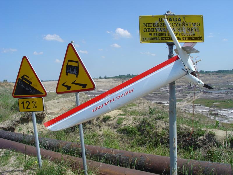 Witam Kolegów ! Jako że pogoda wspaniała-wiaterek tęgawy ..Sirius na niebie szalał...ostatni raz w niedziele ...Nie mogłem odmówic se pokozaczenia...po obłokach ale do czasu...lewe skrzydło odpadło i fruneło z terenu wyrobiska kopalni pod ścianę -skarpę wysokośc skarpy na oko ze 20-30m reszta runeła na teren kopalni. Cusik mnie tkeło by przed lotami załozyć trapery. Kto nie był na terenie wyrobiska kopalni lepiej nich nie wchodzi. Ta reszta lezała z 300m ale musiałem przebrnąc bagna / ugnojony po kolana-dobrze że było dośc twardawo. Ale najwiekśzą niespodziankę miałem z prawym płatem ośiadł na skarpie prawie pionowej-co go miałem sciagnąc zjezdżałem na brzuchu na doł- KINO. Wpadłem na pomyśl by kablem od kosiarki/mocujac knebel/ stracić go na dol. Udało się ...TO BYŁY LOTY...! Pozdrawiam