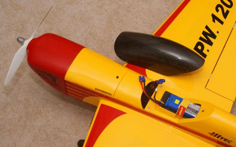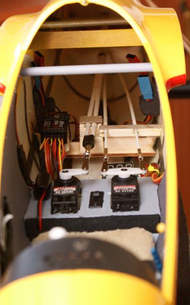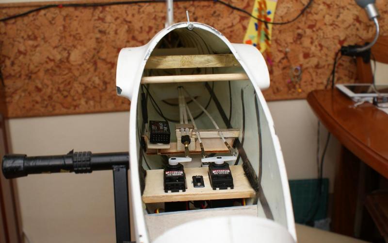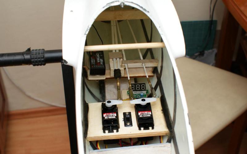 Płoza przednia gotowa, z wyliczanek wychodzi SC 115 mm od natarcia (dla zapasu stateczności 15%) , czyli trzeba dodać w nosku dwa ciężarki po 80 g i wyważenie prawie gotowe. Da to masę modelu gotowego do lotu 3147 g, no jeszcze brak parę drobiazgów w kabinie (oparcie fotela, bagażnik) co da około 50 g - masa końcowa to około 3180 g. Co daje obciążenie powierzchni 54,35. Elektryka gotowa.