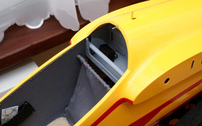 Dokończyłem wyposażanie kabiny i programowanie wychyleń, wyważenie, można uważać prace przy budowie za zakończone (no jeszcze pasy i napis STANDARD). Pozostaje chwila prawdy, czyli oblot Bagażnik jest wyjmowany do montażu skrzydeł - nawet fajnie to działa. Udało się zrobić napisik (w dymku oryginał)