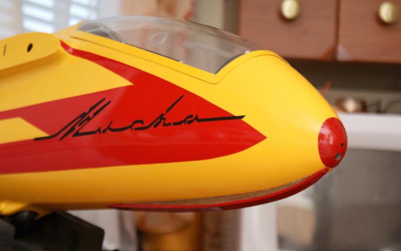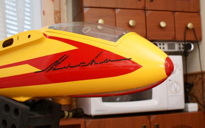Witam. Oblotu jeszcze nie było, bo dopiero kończę płozę przednią, wtedy wyważenie i można będzie myśleć o oblocie. A co do noska to na małego nie da się żywcem przenieść malowania, przemiarki robiłem do różnych wielkości noska i ta najlepiej wygląda.
