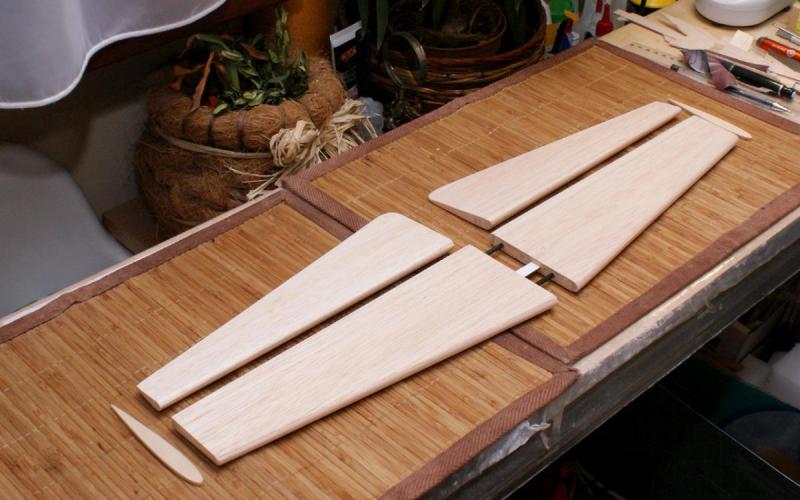 I znowu troszkę do przodu - gotowe pasy dźwigara, lotka i spływ. Zdecydowałem się jednak na bagnet płaski stalowy. Wymagało to wprowadzenia małych zmian konstrykcyjnych w stosunku do kit'u, ale wuszło fajnie. Może jutru uda się zacząc zamykać dźwigar.