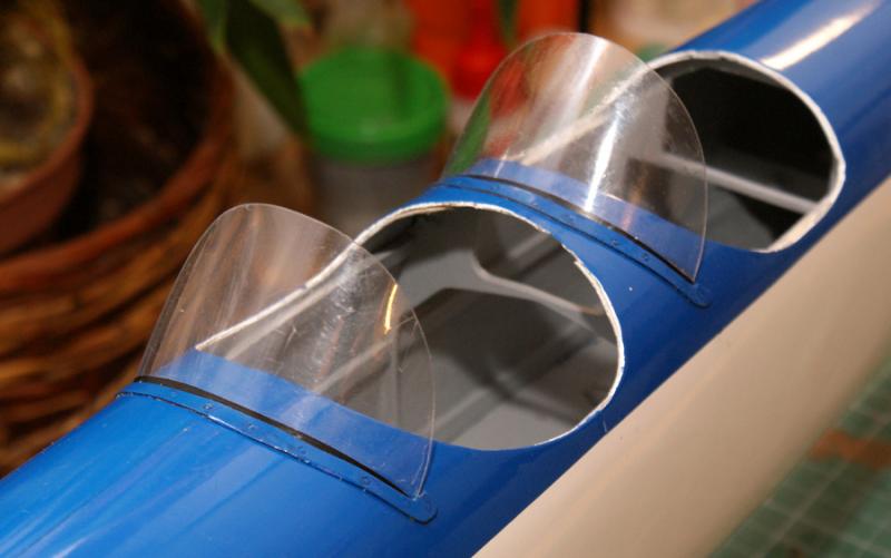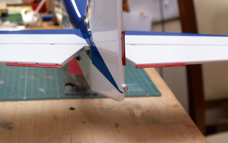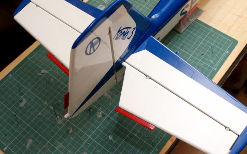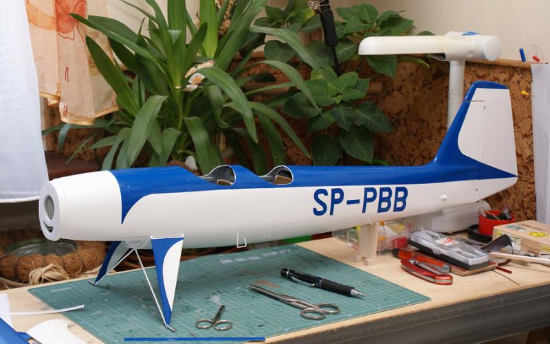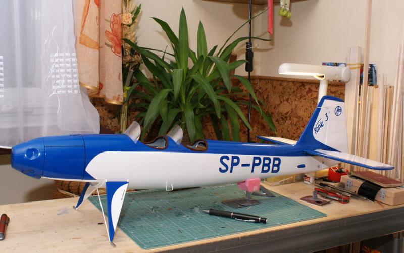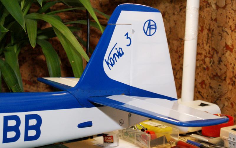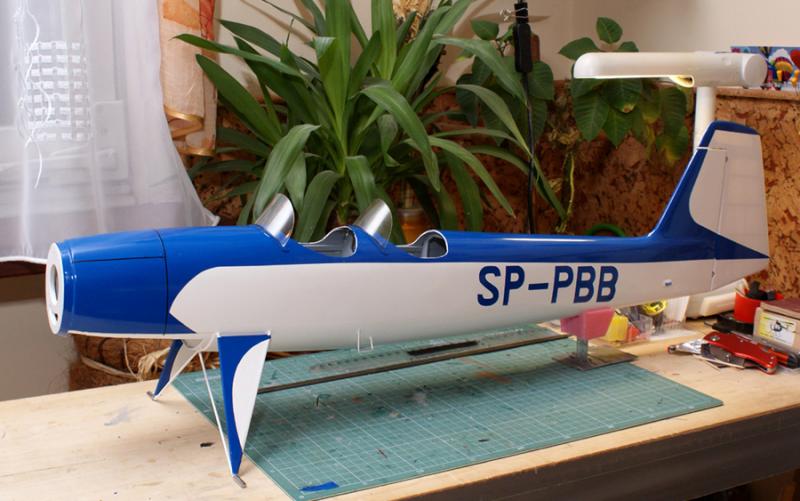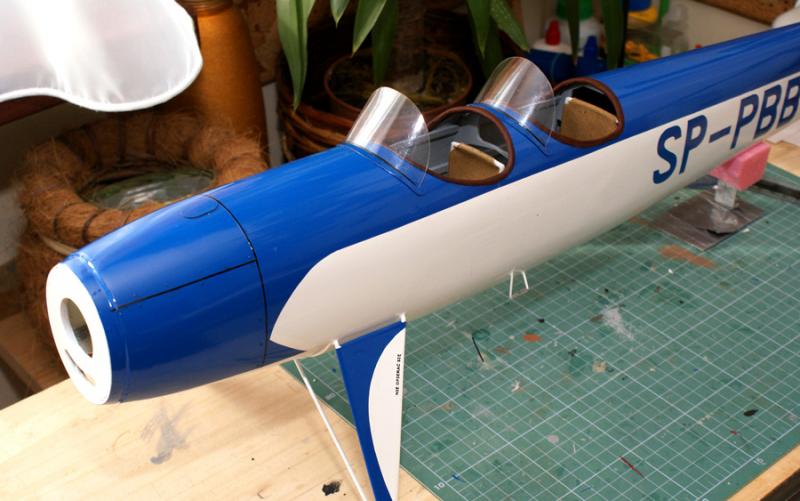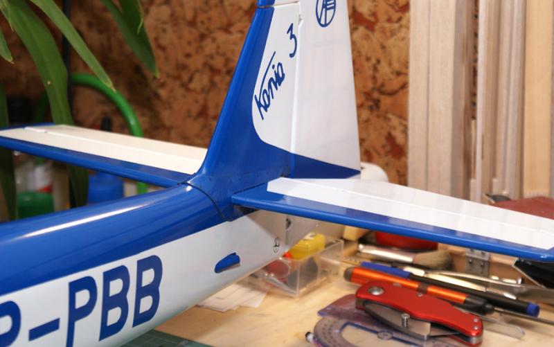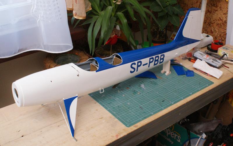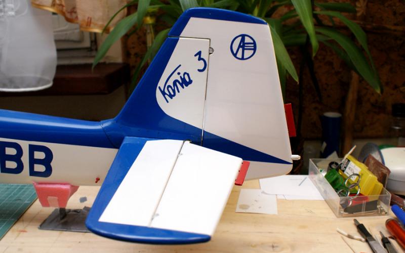 Te akurat wycinałem sam, ale mam zaprzyjaźnioną firmę reklamową, która mi takie rzeczy wycina. Tak, jest to folia dekoracyjna, na laminatowym kadłubie robi się bardzo dobrze. Skrzydło i statecznik, tak biały jak i granat jest termokurczliwa. Troszkę musiałem czekać na granat dekoracyjny, ale jak widać został dobrany prawie idealnie. -