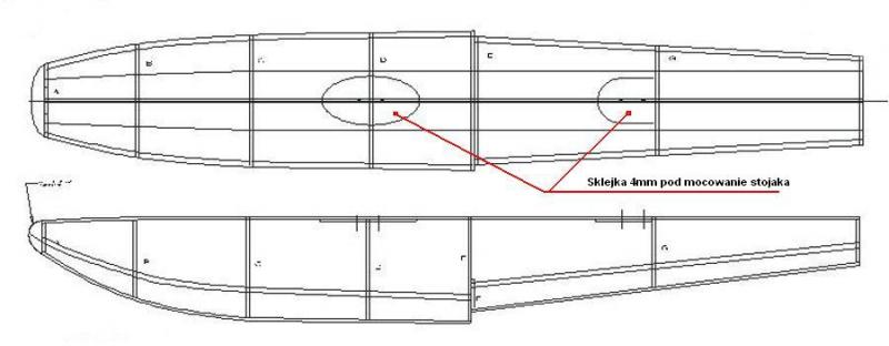 Sklejka ma byś tak jak na rysunku bo jak inaczej zamocować stojak? A co do pokrycia to między balsą 2 mm, a 1,5 jest 38 g zysku ( więcej znacznie zyskałem rezygnując ze sklejki i listewek sosnowych). Zawsze walczymy o gramy, ale czy jest to aż tak ważne, u nas ostatnio więcej wieje niż nie i jak masz lekki model to prawie nie ma nim kiedy latać. Natomiast okucie do mocowania stojak pokazane przez Krzyśka jest ciekawą propozycją.