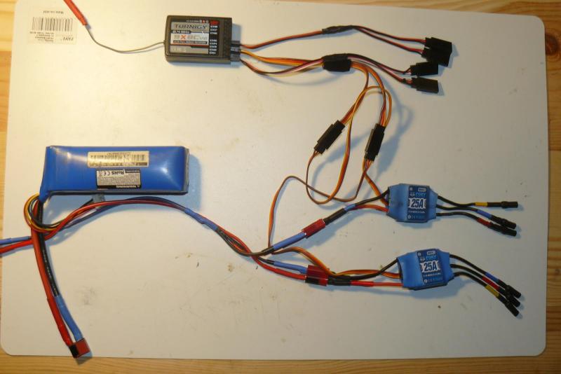 Zastosuję dwa reglery, 2 są trochę lżejsze od 1 dużego, ale łączę je z odbiornikiem przez kabel Y i do kanału 3 (gaz). Zastanawiam się czy na jednym z reglerów nie zostawić tylko szyny sygnałowej. Rzeczywiście, dobrze byłoby zasilać reglery z dwóch kanałów i modyfikować krzywą gazu ale nie wiem jak to zrobić na mojej aparaturze - TURNIGI 9X.