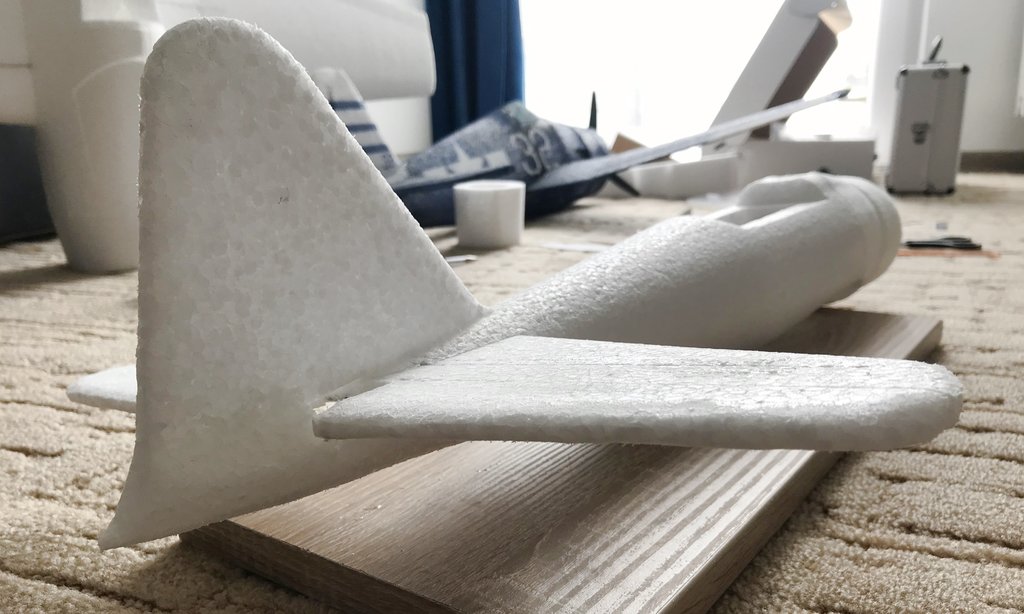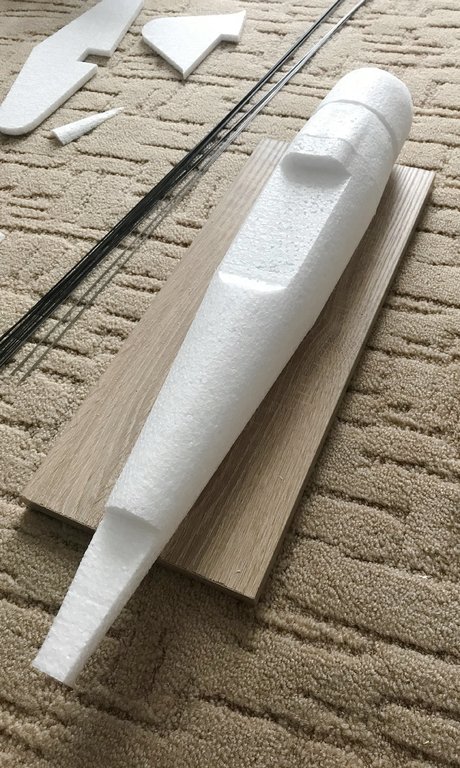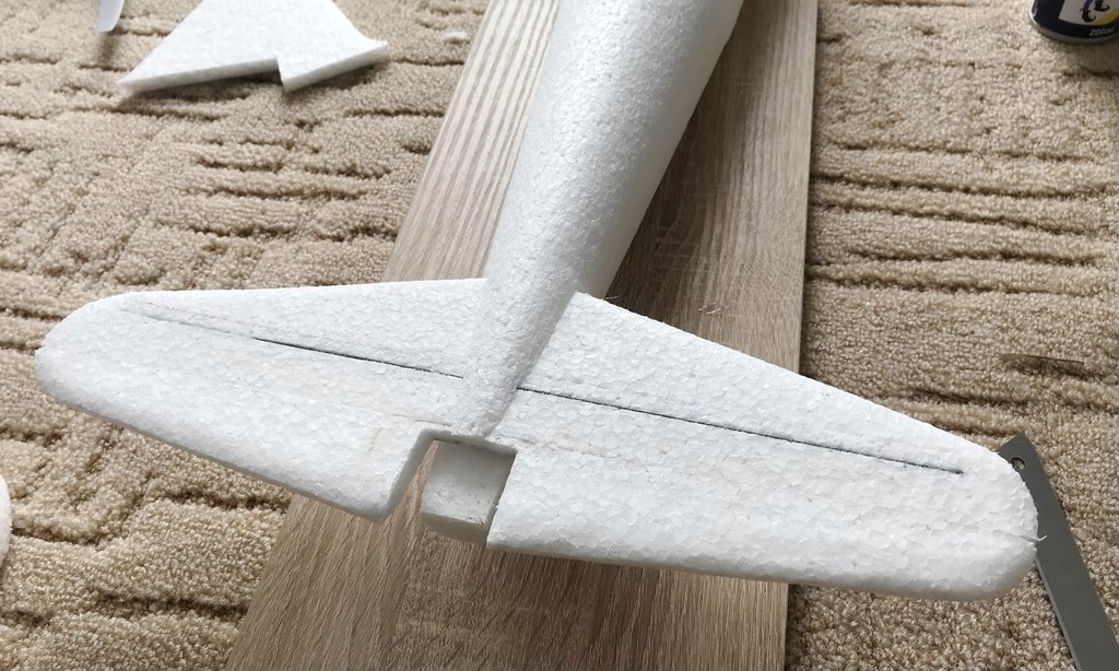 Pora na pierwszy etap prac. Zacząłem od sklejenia i usztywnienia skrzydeł. Od razu wzmocniłem również lotki jak i zamontowałem serwomechanizmy. Statecznik poziomy także już przygotowany. W zasadzie można przejść do kadłuba. Zacząłem od dopasowania silnika w pierwszym segmencie kadłuba. Silnik od razu zamontowałem, a kadłub złożyłem w całość. Popychacz steru wysokości wraz z serwomechanizmem również już na swoim miejscu. Do statecznika pionowego dokleiłem po obu stronach kawałki pianki by ładnie dopasować je do ogona. Tak prezentuje się po oszlifowaniu i wklejeniu całego usterzenia. Niedługo ciąg dalszy.