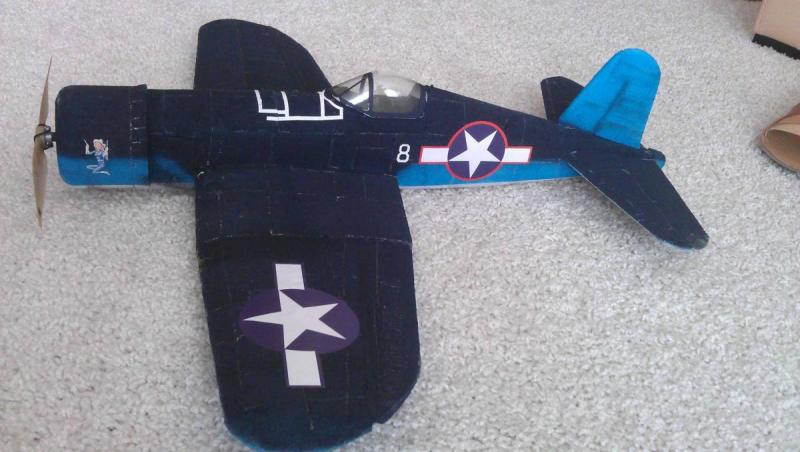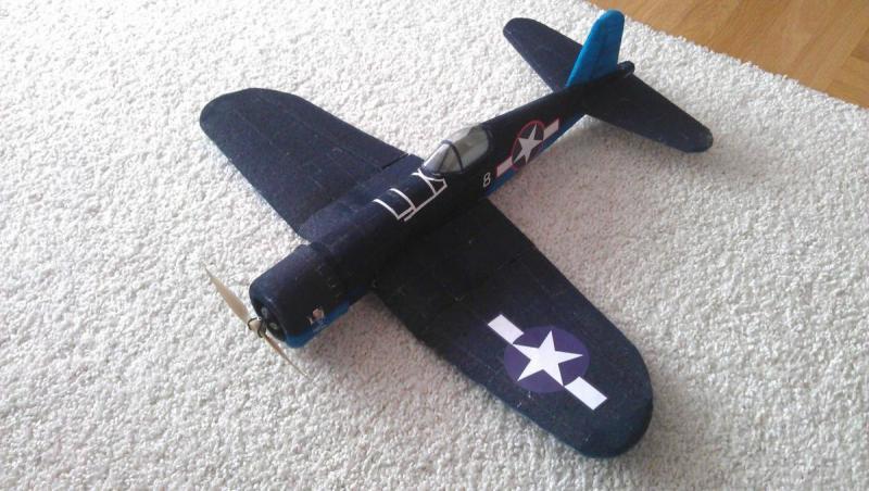Witam Wszystkich, Pora nadrobic zaleglosci w "chwaleniu sie" hmm moze to moja wrodzona skromnosc nie pozwolila na to aby zapreentowac najnowszy wytwor ....... - nie jednak .... to lenistwo ! Ale juz nadrabiam jakis CZAS temu zanabylem (chyba droga kupna?) u Marka R. paczuszke zawierajaca kawalki EPP jakies prety i pare innych ciekwaych elementow ( co jak sie pozniej okazalo po poskladaniu tego w calosc okazalo sie jednym z moich najlepiej latajaych modeli czyli tytulowym Corsair'en w wersji F4U. Na temat technologii wykonania rozpisywal sie nie bede poniewaz to w zadzadzie dobrze znany standard ktory wlasciwie wszysscy to zagladajacy znaja i stisuja. Jedynie co chcialbym potwierdzic to skutecznosc szlifowania pianki "na mokro" ktorys z kolegow lub kolezanek wczesniej ta technike opisywal. Daje fajana fakturke i wydaje mi sie ale to subiektywne odczucie nie powoduje tak wyrwan w piance. Troche zabawy jest z wklejaniem wzmocnien w skrzydla, byla to zabawa "na cztery rece" i wyszlo ok. To chyba jedyna "niezwyklosc"- no moze jeszcze z rzeczy zadkich to ster kierunku (zreszta juz nie dzialajacy - uszkodenie mechaniczne serwa po jednym krecie), a i nawet jak serwo dzialao to SK nie robil - blad konstrukcyjny dla spostrzegawczych widac to na zdjeciach. Model lata zaje-bozzzko, jest niesamowicie stabily w locie przy jednoczesnej duzej sterownosci. Beczki, petle czysciutko, lata wystarczajaco szybko ( jak dla mnie) a i szybowac potrafi. Napedza go klasyk czyli czarny Tower Pro z smiglem 9x6 /w testach 6x4/, jesli chodzi o wage to ......... jest na limicie, ale w limicie Ponizej kilka fotek - film jeszcze nie powstal, powstanie mam nadzieje jeszcze w zimowej scenerii bo pieknie sie prezentuje w bialych okolicznosciach przyrody. Malowanie w zalozeniach mialo byc takie A wyszlo takie : Maszyna lada dzien otrzyma piekne znaki, i bedzie gotowa do filmowania.