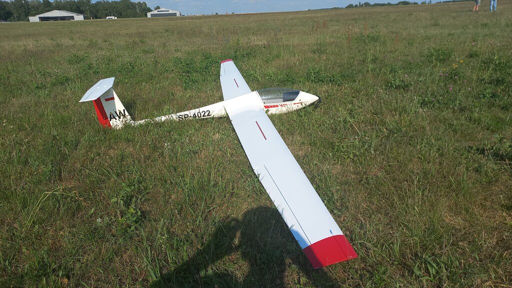 W poniedziałek wykonałem oblot modelu szybowca ASW-19, o którym wspomniałeś Arku w swojej relacji. Szybowiec ma rozpiętość 3,75m i waży 4,8kg. Pierwszy start wykonałem z wózka, ponieważ większymi cięższymi szybowcami dla bezpieczeństwa zawsze tak startuje. Wzleciałem na bezpieczną wysokość, aby szybując wyczuć model. Po kilku minutach szybowania odleciałem dalej by zaplanować bezpieczne lądowanie. Samo lądowanie przebiegło bardzo pozytywnie. Pierwsze lądowanie wykonałem bez hamulcy, ponieważ nie wiedziałem, jaką będą miały skuteczność. Po wylądowaniu wykonałem następny lot, w którym wytrymowałem model na lotkach i kierunku. Sprawdziłem skuteczność hamulców, działają one poprawnie (spowalniają model i powodują minimalne opadanie).