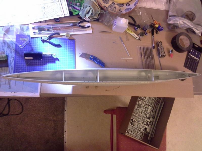 Cześć. Ponieważ moje wcześniejsze rozwiązanie, oklejenia kadłuba papierem japońskim delikatnie mówiąc nie zyskały akceptacji musiałem pozyskać nowy kadłub. Piotr pomógł i w ten sposób wszedłem w posiadanie jego projektu ponieważ przewiduję problemy z wyważeniem postanowiłem przesunąć przegrodę silnika do przodu i osłonić go tylko chłodnicą