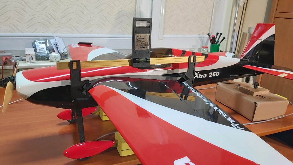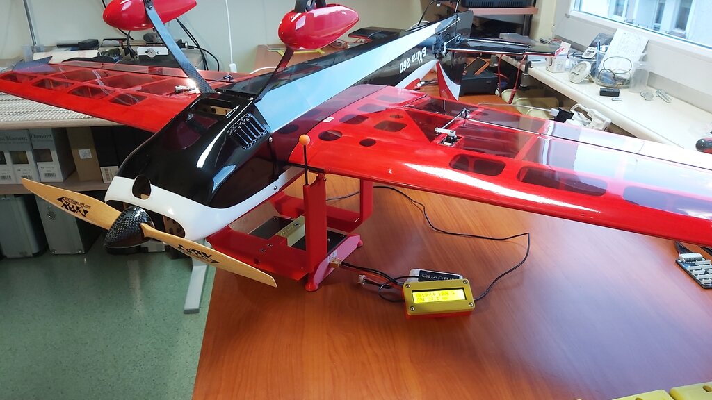 Kilka dni temu dopadło mnie jakieś przeziębienie i nie byłem w stanie nic podziałać -totalne nieróbstwo. Jednak dzisiaj poczułem zdecydowaną poprawę i pomyślałem, że trzeba zrobić obiecany test wagi na modelu z kółkiem ogonowym. Niestety nie mam modelu o ciężarze godnym tej wagi ale posiadam dyżurną kilówkę Extra 260 od PA. Najpierw ustaliłem CG za pomocą typowej modelarskiej wagi tensometrycznej w której model podparty jest w czterech punktach pod skrzydłem. Zmierzone CG znajduje się 94,5 mm od krawędzi natarcia. W tym miejscu od spodu płata nakleiłem taśmę maskującą i zaznaczyłem czerwoną kreską wyznaczone CG. Następną ważną czynnością było takie podparcie pod kółkiem ogonowym aby skrzydło było na 0 stopni. Podłożyłem jakiś karton, kawałek sklejki i jest dobrze. Podłożyłem pod koła trzy wagi. Zmierzyłem odległość od osi głównego podwozia do rzutu osi kółka ogonowego. Wartość wpisałem do programiku CG Scale i dowiedziałem się w jakiej odległości od rzutu osi kółka ogonowego znajduje się CG. Wskaźnik laserowy położony w odpowiednim miejscu przymiaru wskazał mi punkt CG. Najbardziej zdziwiło mnie to, że ten punkt idealnie pokrywał się z tym wcześniej wyznaczonym CG . Śmiało mogę stwierdzić, że waga choć zaprojektowana dla modeli z kółkiem dziobowym (autor projektu lata odrzutowcami), nadaje się również do modeli z kółkiem ogonowym. Ponieważ projekt jest jak najbardziej udany zachęcam modelarzy do budowy ?.