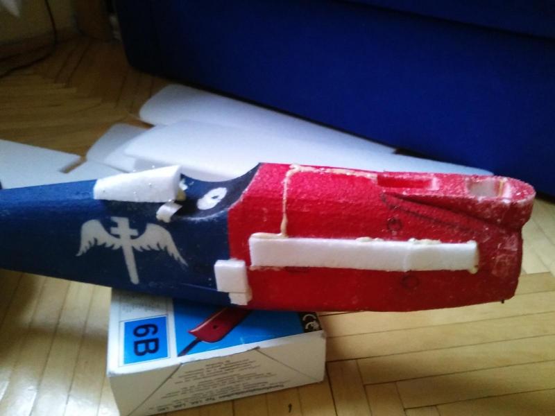 Jeżeli będziesz miał zestaw od Marka R. To parę podpowiedzi do budowy. Kadłub rzeczywiście bardzo fajny i lekki ( pusty w środku) Nie trzeba nic strugać wystarczy skleić i gotowe:) Wykorzystałem "odpad" ze środka na wzmocnienie przodu (pakiet i serwa muszą się gdzieś trzymać Model ma bardzo krótki przód. Serwa daj od razu za silnikiem, sam silnik ile da się do przodu. Gdzieś mam zdjęcia zrobione na szybko komórką jak znajdę podeśle. Generalnie gdyby nie brak przodu byłby znakomity:) (waga, zwarta konstrukcja, prostota budowy) Znalazłem zdjęcie: Co do braków sprzętowych. Mój z zeszłego roku idzie do remontu:) Nowe skrzydła i będzie nówka sztuka nie latana (Niemiec do granicy gonił )
