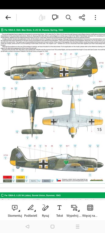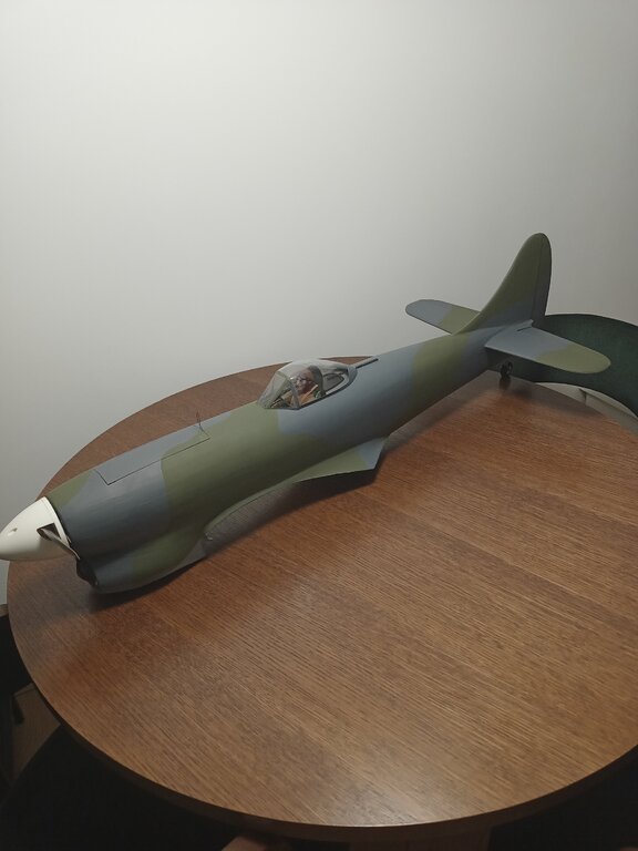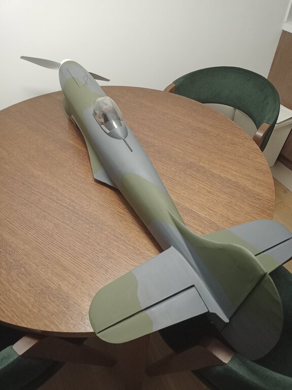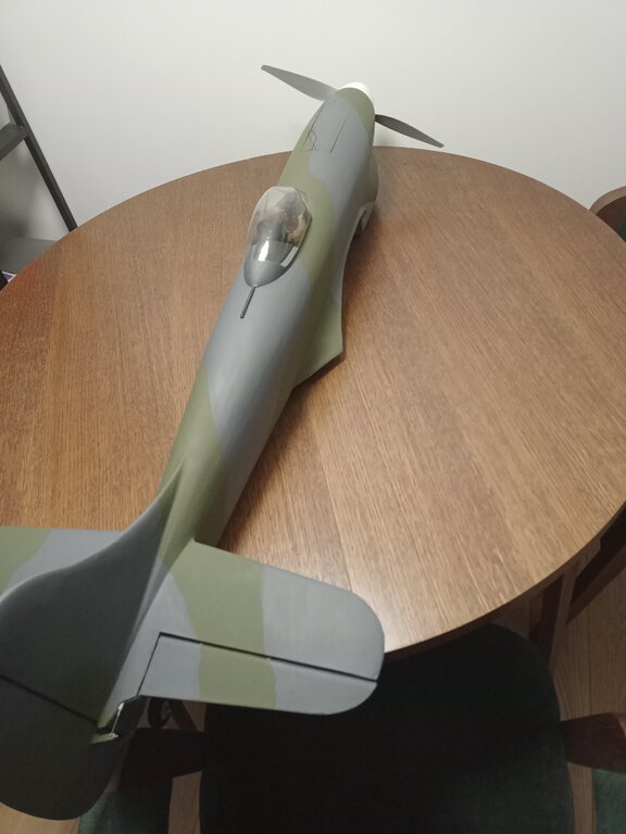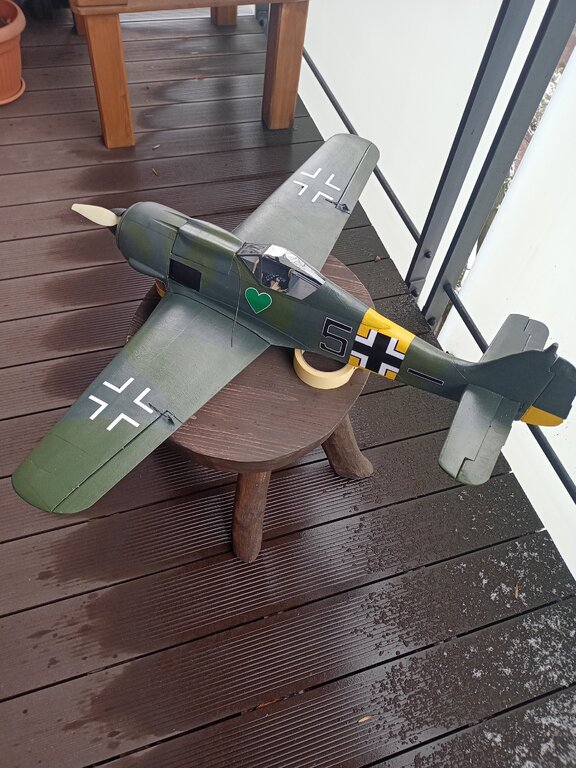 Ile to już lat 😜 początek marzec 22r. A niby takie maleństwo, nie miej nareszcie ukończone, czeka na oblot 😁 Trochę danych Silnik duzalsky Eco V2 2312c 1150kv śmigło będzie składane graupner 10x5 wedle producenta na tym śmigle 1100g ciągu przy max 20.5A Regulator dualsky litle 22A Bateria dla stron 1300mah 40 c 3 serwa rower pro 90s ( lotki, klapy, wysokość) Waga do lotu 808 g Pow nośna jakieś 1154dm Obciążenie około 70g/dm Tyle z danych technicznych, ogólnie starałem się wszystko upchnąć przed SC ( krótki nos) co poskutkowało eleganckimi wyważeniem 👍 Silnik trochę na styk ale raczej powinien polecieć. Co do scenerii zdjęć to od razu przepraszam😜 Jeśli chodzi o wykończenie modelu to cóż powierzchnia tragedia, z racji tego że klejenie japonki na nitrocellon odpada, tym razem zastosowałem lakier akrylowy bezbarwny i wyszła kaszka plus zmarszczki japonki, do tego gęsta dobrze kryjaca farba italeri i efekt gotowy 😜 nie polecam. ( Model świeci się jak psu..... Ale spokojnie będzie cieplej to nałożymy warstwę polmatu tym razem spray i będzie cacy ) Co do kolorów i malowania to front wschodni 1943 pilot. Max Stotz Kolory góra rlm 70,71 dół rlm 76