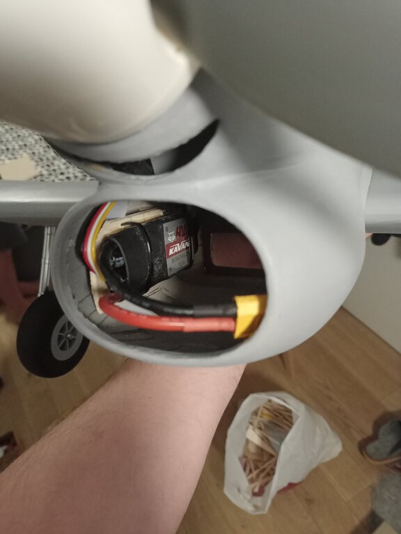 Wielki ,,comebeck" po 2.5 roku z jednym zdjęciem Regulator zamontowany na samym przodzie w brodzie, kavan 60A Pomimo tego żeby wyważyć sprzęt potrzeba dużo ciężaru, to tragedii nie będzie, co prawda myślałem że trzeba będzie zaopatrzyć się w pakiet 5000mah 6 s to po wstępnym,,przebadaniu sprawy" wystarczy pakiet 4000mah 6s około 620 g Wszystko razem na gotowo do lotu będzie ważyć 2550 g obciążenie powierzchni około 70 g/dcm także chyba będzie cacy. Dla pewności wrzuciłem wszystko w eCalc i jest oki. Ps. wleciały też koła piankowe o większej średnicy 90 mm, co by ładowanie było miękkie