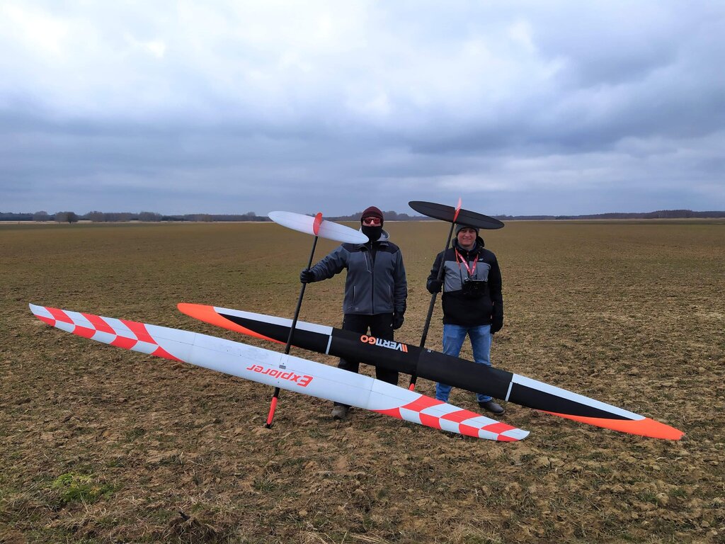 Czekając na wiosnę, którą widać na horyzoncie w następnym tygodniu zabraliśmy się we 3 na oblot nowego sprzętu. Pogoda dzisiaj dała popalić, pozytywnie i negatywnie. Mimo że było -2*C do tego wiatr w porywach osiągał ok 5m/s, to dało się prawie w każdym locie zabrać. Wystarczyło max 50m. Poniżej wrzucam loga z mojego Vertigo (27m wyłączony silnik i lot w opadach śniegu) i zdjęcie, a wieczorem film.