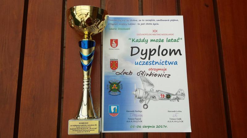 Duży nie latał bo jeszcze nie jest ukończony ale już robi niesamowite wrażenie. Będę obecny przy oblocie to zdam pełniejszą relację. A tymczasem trafił się mojej 11-tce ku mojemu zdziwieniu puchar za.... makietę lll miejsce, do zaakceptowania bo wyżej sam bym jej nie ocenił Ale dzięki temu a może i wspólnym lotom z modelami o napędzie spalinowym postanowiłem tej zimy zrobić wersję spalinową. Już bez zbytniego pośpiechu,na spokojnie, może bardziej makietowo W Kraśniku lataliśmy tylko we dwóch z Pawłem ale te loty bardziej wyglądały na walkę powietrzną niż na spokojną prezentację. Może ktoś to filmował? Brakowało nam tylko tasiemek Może za rok przy okazji XX mityngu w Kraśniku zorganizujemy taką walkę? Nieprawdopodobne ale niewykluczone -