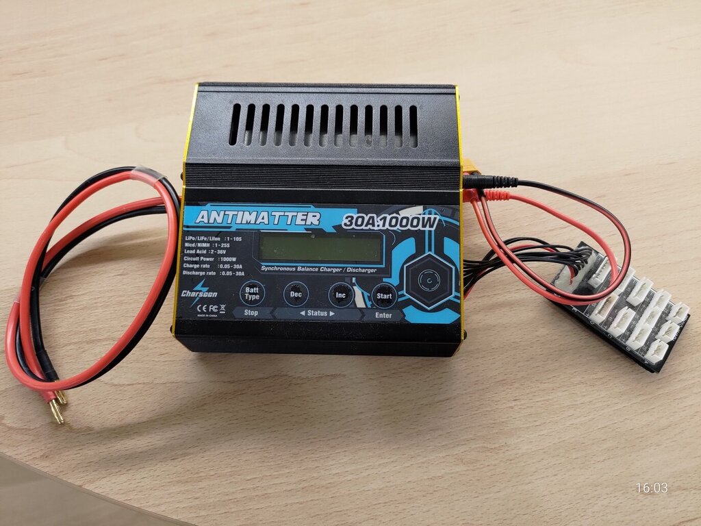 Ładowarka w idealnym stanie Specification Brand Name Charsoon Model Number Antimatter Input Voltage DC: 5 - 36V Charge Current 0.05 ~ 30A Discharge Current 0.05 ~ 30A Maximum Charge Capacity 1000W@input voltage 23V (500W@input voltage 12V) Maximum Discharge Capacity 80W Maximum Extern Discharge Power Capacity 1200W@40V/30A Maximum Regenerative Discharge Power Capacity 1000W Current Drain For Balancing LiPoly <500mAh/cell Balance Accuracy <10mV Battery Setup Memory 10 Lithium (Li-poly/LiIo/LiFe) Cell Count 1 ~ 10 series NiCd/NiMH Cell Count 1 ~ 25 series Pb Battery Voltage 2 ~ 36V Log Files Storage 16Mbit (31 hours) Intelligent Temperature Control Yes PC Connect USB Port Dimensions 143 x 146 x 55mm Weight 870g cena 400zł