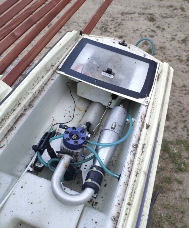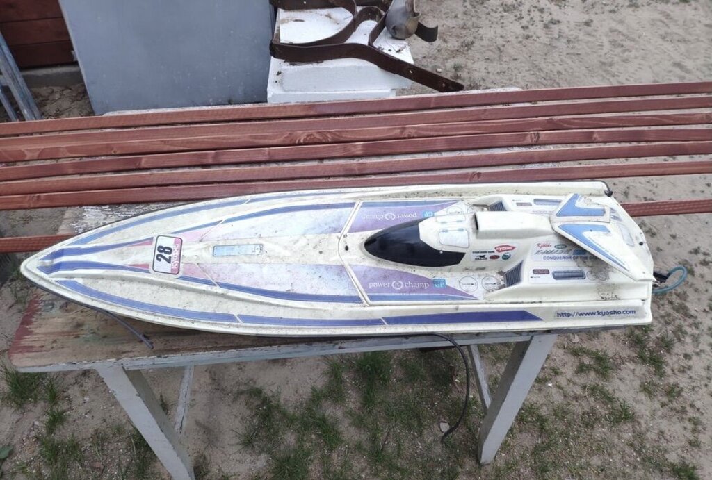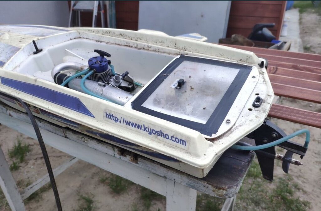 Witam Stalem się posiadaczem dość dużej łódki ponad 1Metr firmy KYOSHO lecz w internecie ciężko coś znaleźć o niej. Silnik i inne elementy obracają się wyglada jak by ktoś ja przygotował na długi postój i wszystko zakonserwował. Skorupa wyglada na starą, a silniczek na nowszy. Czy ktoś wie co to za model jakieś informacje co do silnika czy jest oryginalny jaka ma pojemność? Od doku jest raczej kompletna śruba napędowa jest połączona z serwomechanizmem. Pewnie wymaga sporo pracy do zabawy, ale wydaje się kompletny. Z mankamentów znalazłem ulamane skrzydło kadłuba. Ile warty jest taki model jest to mój pierwszy pojazd wodny, ale wszystko co ma silnik spalinowy mnie interesuje. -
