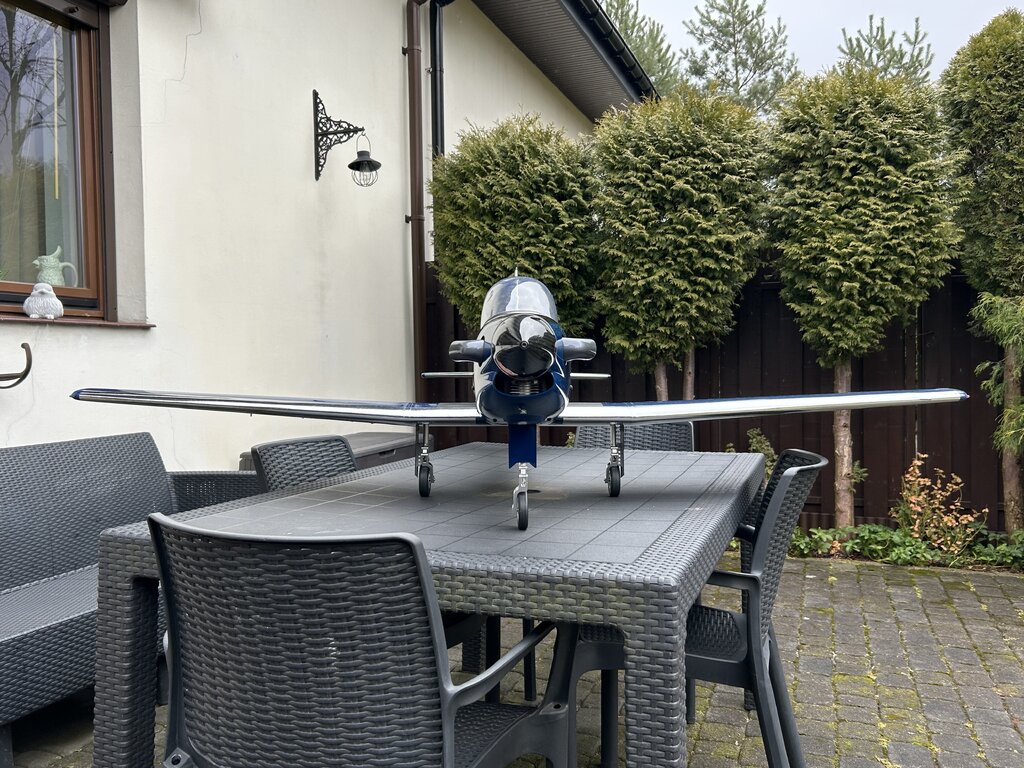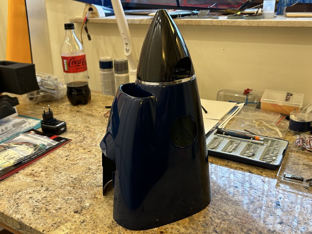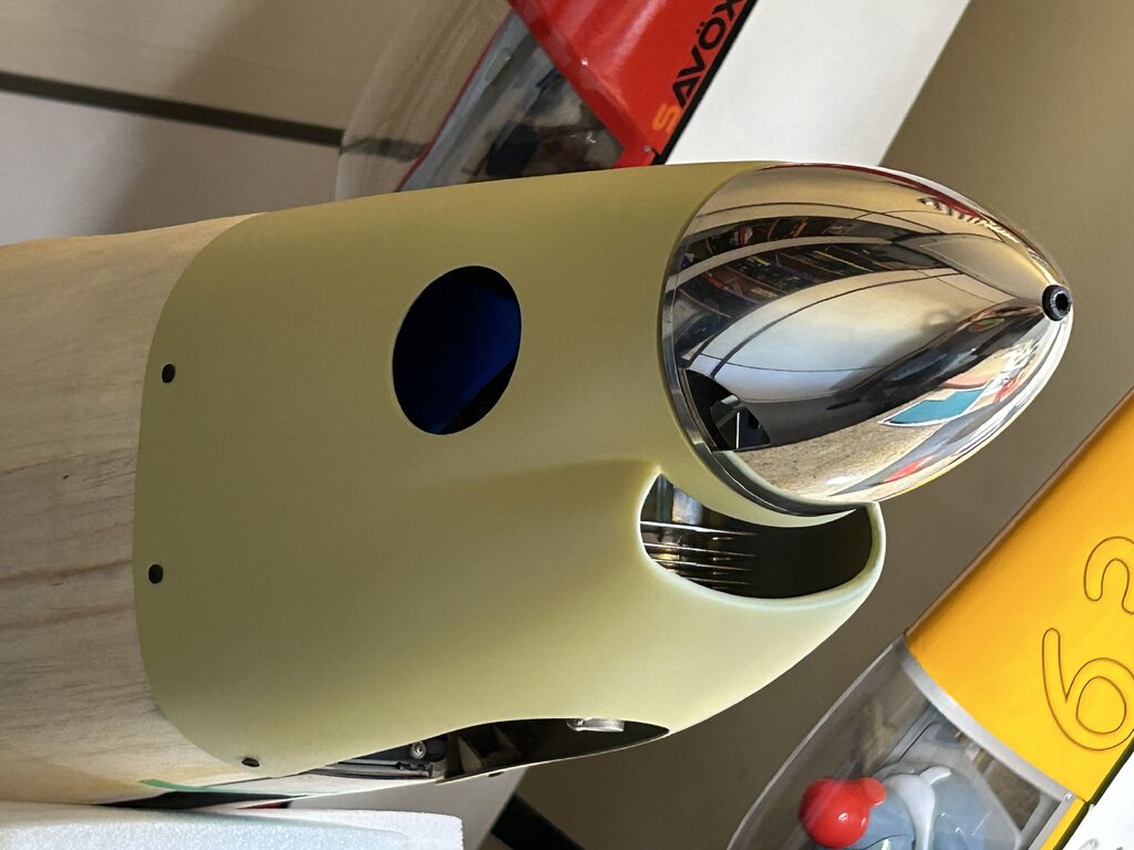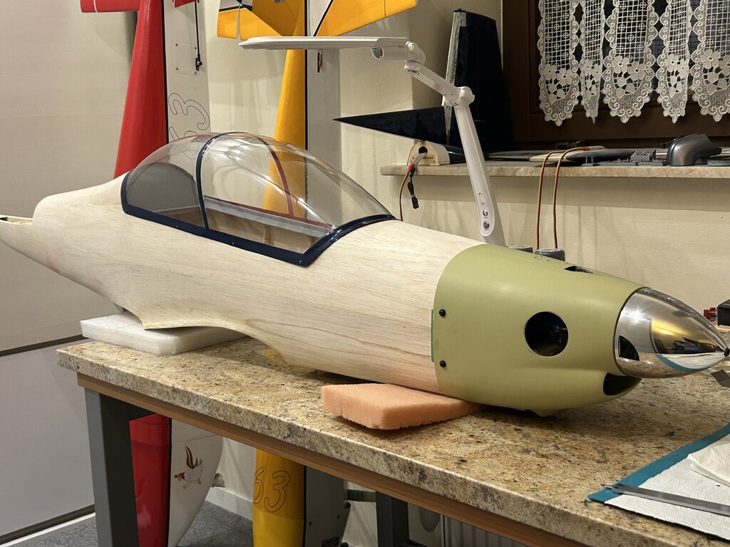 Trochę czasu minęło, czas na kontynuację a więc.... Aktualnie wciąż męczę się z różnymi drobiazgami, głównie z maską silnika. Chodzi o to by motor był jak najbardziej schowany a jednocześnie dobrze chłodzony i całość widziana z zewnątrz nie odbiegała bardzo od oryginału. Z tych powodów wszystko się przedłuża choć teraz jestem już blisko finału. Za kilka dni maska powinna być gotowa. Ponadto zmieniłem kołpak z aluminiowego na węglowo-alu. Udało się znaleźć kołpak węglowy o lepszym kształcie i wadze, który dopasowałem do podstawy alu i chyba tak zostanie. Trochę szkoda bo kołpak alu wyglądał super tylko kształt miał taki sobie. Gdy skończę z maską wrócę do kabiny. Kabinę z zestawu widać na jednym ze zdjęć. Jakość dość marna, jest nierówna, są bąbelki od zbyt wysokiej temp tłoczenia, kształt ma nieodpowiedni no i „rama” inna niż powinna być. Daleko jej do oryginału. Dlatego wciąż się waham czy do oblotu zostawić oryginalną a potem się męczyć z nową czy też od razu przysiąść i zrobić jak ma być czyli nową owiewkę wraz z ramą laminatową. To dużo pracy więc mam wątpliwości, niedawno zdałem sobie sprawę, że przebudowa modelu ARF trwa już drugi rok (!) więc już starczy - do wiosny ‘25 chcę doprowadzić model do stanu do oblotu. Z obliczeń wyszło, że skala modelu liczona dla skrzydeł jest nieco inna niż kadłuba. Wartości są zbliżone, średnia to 1:5,54. Czyli szukam pilota w tej właśnie skali. W sklepach można znaleźć gotowych gości typu ‘jet pilot’ w skali 1/5 lub 1/6 więc nie jest źle, coś się dobierze ale to już na samym końcu. Kolejna aktualizacja za jakiś czas... Naprawdę nie wiem dlaczego kolejność zdjęć jest przypadkowa 🤔