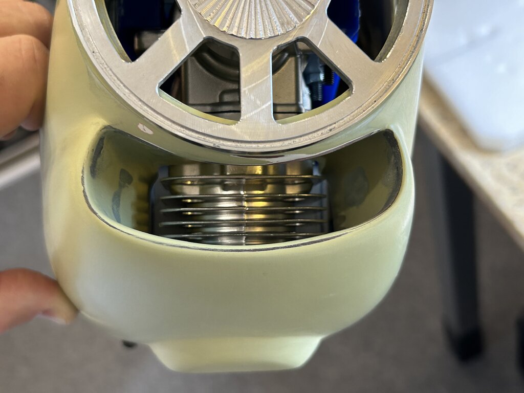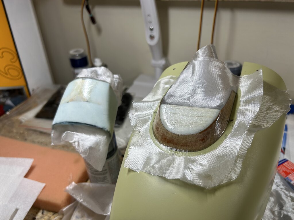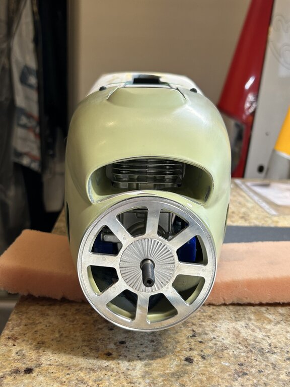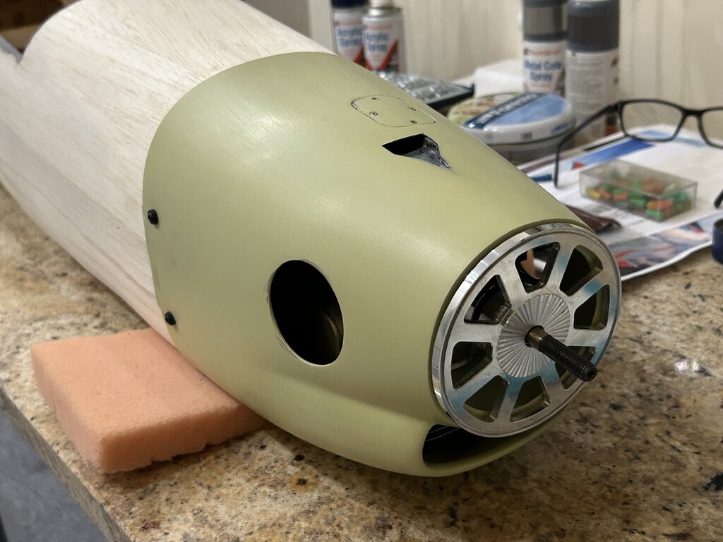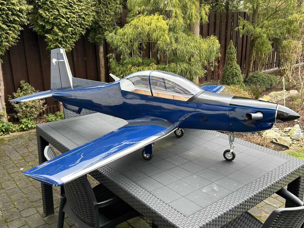 Trochę czasu minęło, czas na kontynuację a więc.... Aktualnie wciąż męczę się z różnymi drobiazgami, głównie z maską silnika. Chodzi o to by motor był jak najbardziej schowany a jednocześnie dobrze chłodzony i całość widziana z zewnątrz nie odbiegała bardzo od oryginału. Z tych powodów wszystko się przedłuża choć teraz jestem już blisko finału. Za kilka dni maska powinna być gotowa. Ponadto zmieniłem kołpak z aluminiowego na węglowo-alu. Udało się znaleźć kołpak węglowy o lepszym kształcie i wadze, który dopasowałem do podstawy alu i chyba tak zostanie. Trochę szkoda bo kołpak alu wyglądał super tylko kształt miał taki sobie. Gdy skończę z maską wrócę do kabiny. Kabinę z zestawu widać na jednym ze zdjęć. Jakość dość marna, jest nierówna, są bąbelki od zbyt wysokiej temp tłoczenia, kształt ma nieodpowiedni no i „rama” inna niż powinna być. Daleko jej do oryginału. Dlatego wciąż się waham czy do oblotu zostawić oryginalną a potem się męczyć z nową czy też od razu przysiąść i zrobić jak ma być czyli nową owiewkę wraz z ramą laminatową. To dużo pracy więc mam wątpliwości, niedawno zdałem sobie sprawę, że przebudowa modelu ARF trwa już drugi rok (!) więc już starczy - do wiosny ‘25 chcę doprowadzić model do stanu do oblotu. Z obliczeń wyszło, że skala modelu liczona dla skrzydeł jest nieco inna niż kadłuba. Wartości są zbliżone, średnia to 1:5,54. Czyli szukam pilota w tej właśnie skali. W sklepach można znaleźć gotowych gości typu ‘jet pilot’ w skali 1/5 lub 1/6 więc nie jest źle, coś się dobierze ale to już na samym końcu. Kolejna aktualizacja za jakiś czas... Naprawdę nie wiem dlaczego kolejność zdjęć jest przypadkowa 🤔