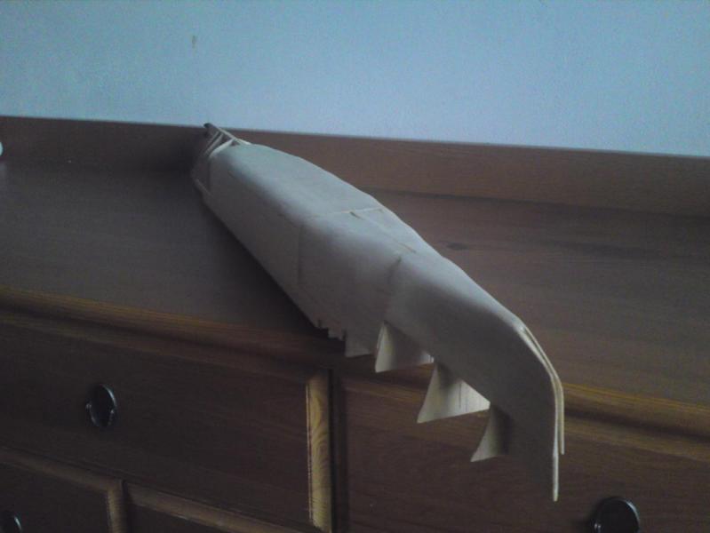 Zacząłem pokrywać kadłub. Trudne to i pracochłonne, ale jakoś wychodzi. Dużo szpachlowania będzie i tak. Dostałem również od wydawnictwa Szkutnik Kartonowe modele do sklejania: Titanic, Olympic i Britannic, które będę sklejał w międzyczasie. -