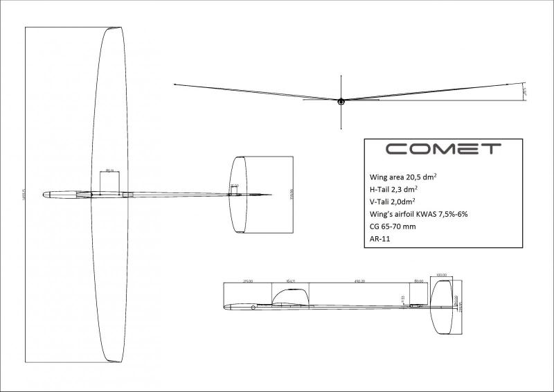 COMET to nowy model produkowany przez polską firmę EKSPERT. Projekt zakładał wykorzystanie najnowszych trendów oraz technologii stosowanych w F3K DLG. Stroną obliczeniową zajął się Kamil Wijatkowski, a technologiczną właściciel firmy Adam Siama (III miejsce klasyfikacji generalnej Pucharu Świata F3K 2013). W listopadzie 2014 został opracowany prototyp, który po wykonaniu dużej ilości lotów i porównaniu z założeniami teoretycznymi został wprowadzony do produkcji. Skrzydło Profil skrzydła został specjalny obliczony dla modelu COMET - o grubości od 7,5% (8 cm) do 6% przy kocówce skrzydła. Zabieg ten ma na celu pogrubienie części skrzydła w której montuje się serwa, tak aby można umieścić serwa o rozmiarze do 11,5 mm (np. Futaba 3154, Sanwa 94803 itp.). Takie rozwiązanie redukuje koszty wyposażenia modelu, ponieważ pozwala na zastosowanie tańszych serw. Przy konstrukcji skrzydła modelu wykorzystana została tradycyjna budowa typu ”sandwich”, która cechuje się bardzo dużą gładkością powierzchni, pozwalać dokładnie odwzorować profil. Jako materiał przekładkowy użyty został Rohacell 1mm w odmianie IGF 31 lub IGF 51 ( w zależności od wersji modelu). Unikalna konstrukcja wnętrza skrzydła gwarantuje dużą sztywność przy zachowaniu niskiej masy. Kadłub Zgodnie z panującymi trendami i wnioskami wyciągniętymi z testów prototypu, kadłub został skrócony w tylnej jak i przedniej części, powodując zmniejszenie jego masy bez kompromisów w kwestii wytrzymałości. Przednia część kadłuba zaprojektowana została by umożliwić poziome umieszczenie serwa o gabarytach HS 45HB, odbiornika R617, dwóch sztuk akumulatora o pojemności 520 mAh, regulatora oraz balastu. Stery Rdzeń sterów został wykonany z pianki Rohacell IGF 31 oraz włókna szklanego 17g/m2. W sterze poziomym podczas laminowania wykonane są otwory, które gwarantują precyzyjne przymocowanie do kadłuba. W sterze pionowym zastosowane zostało prowadzenie rury ze wzmocnieniem, które w znaczny sposób ułatwia montaż. Ster pionowy jest również symetryczny wzdłuż osi kadłuba, który umożliwia prawidłowy montaż przez osoby rzucające zarówno lewą jak i prawą ręką. Więcej informacji oraz instrukcja ukaże się wkrótce na stronie www.sklepekspert.pl. Cena modelu to ok. 520 euro.