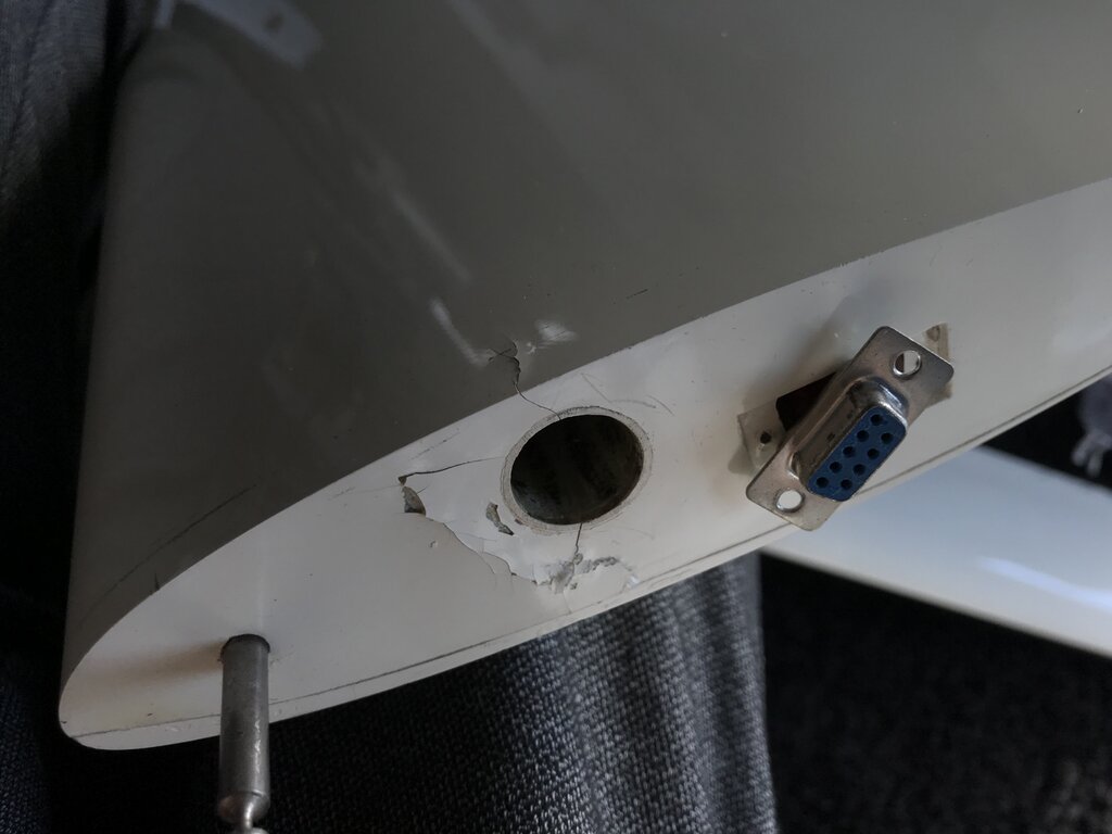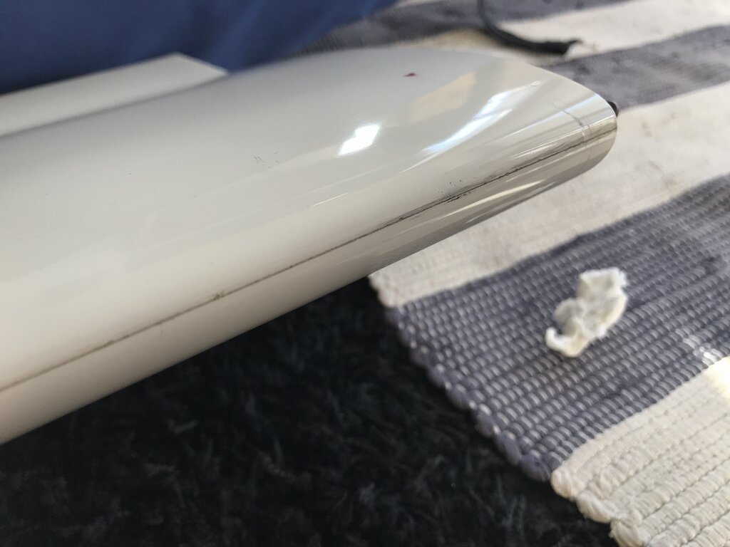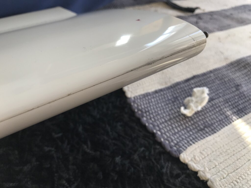Po twardym a nawet mocno twardym lądowaniu wszystko wyglądało ok ale potem zobaczyłem coś takiego. Wygląda, że konstrukcja jest nienaruszona bo mocno wszystkim ruszałem zarówno osobno jak i zmontowane na kadłubie ale wyglada to poważnie. RURA Czy jesteście za tym aby to całkiem otworzyć? W sensie od nasady chyba bym to robił. I pooglądać w środku dokładnie? Czy po prostu porobić małe dziurki, wstrzyknąć żywice i tyle? NATARCIE tutaj nie wiem czy już to było czy nie przed tym twardym. Nie widać na zdjęciach ale jak przejadę paznokciem to na odcinku 10-15 cm czuje rysę. I jest tam taki minimalny luz. I tutaj całkiem nie mam pomysłu jak to porządnie zrobić.