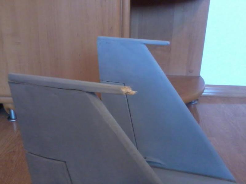 Gapa ze mnie i przy wykonywaniu owiewek na statecznikach nie zwróciłem uwagi, że w oryginale lewa owiewka mieszcząca antenę RWR jest większa od prawej. Zrobiłem obie jednakowo i na dodatek zeszlifowałem je na równo z powierzchnią statecznika. Jak już zauważyłem popełniony błąd to stwierdziłem, że to nie makieta i zostawię jak jest, bo nie chce mi się odcinać wyszpachlowanych już elementów. W tym momencie do akcji weszła FKKJ, opinia jak widać po fotce była jednoznaczna - nie będziemy tolerować takiej fuszerki. Teraz chcąc nie chcąc muszę wykonać owiewki na nowo.