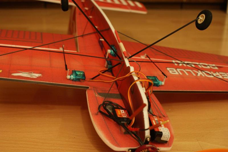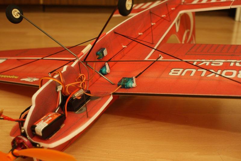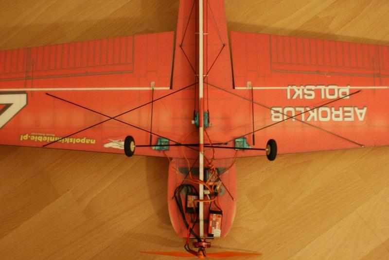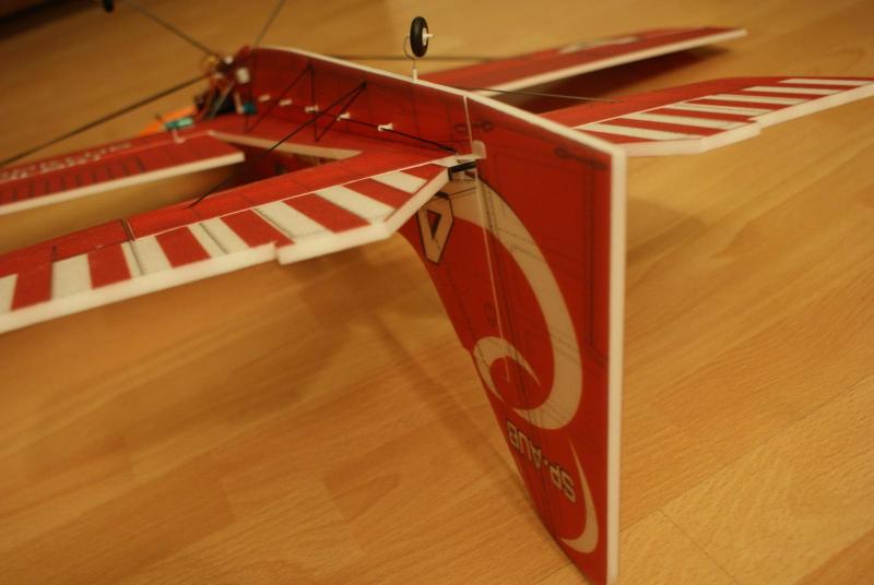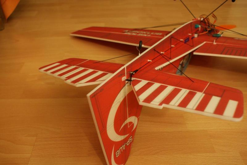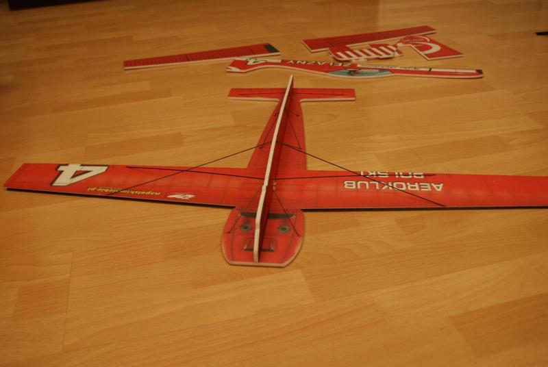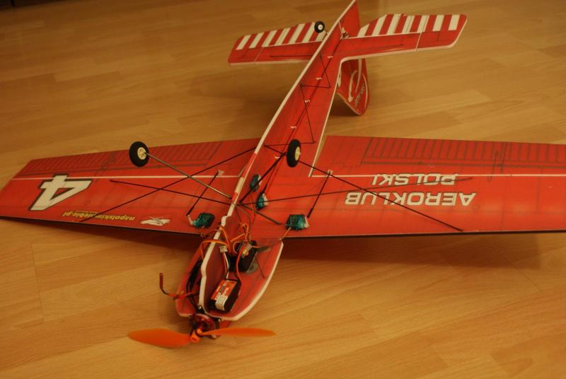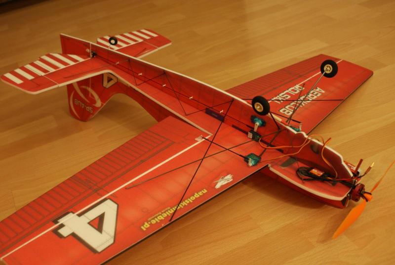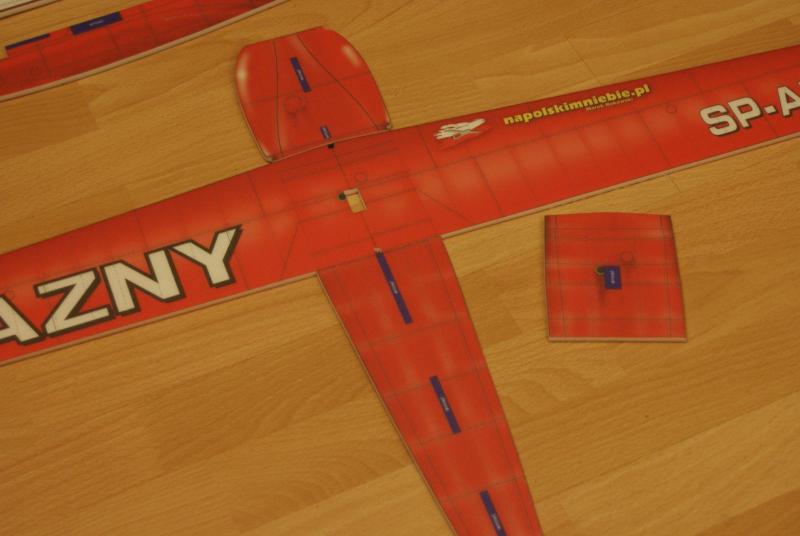 Paczka doszła, model złożyłem dość szybko, i chyba nie pomyliłem się co do wagi. Do klejenia użyłem UHU-PORa i cyjaka do depronu, zawiasy steru wysokości to kavan, a lotek i steru kierunku to poliester. Postanowiłem przerobić trochę konstrukcję tak, aby linia skrzydła pokrywała się z linią poziomej części kadłuba Wyposażenie: -silnik: hk 3010 2100kv -regiel: RAY 12A -serwa na ogon: 2xGO 05 -serwa na lotki: 2xSO403 -pakiet: RAY 350 mAh 7,4V -śmigło: GWS 8/4,3 -waga do lotu: 197 g -CG znajduje się w odległości 6,5 cm od krawędzi natarcia w stronę ogona. (mierzone w miejscu łączenia się kadłuba z płatem) Nie zdążyłem połączyć koła ogonowego ze sterem kierunku, zrobię to jutro. Jutro też będzie oblot modelu i mam nadzieję, że ktoś to nakręci -