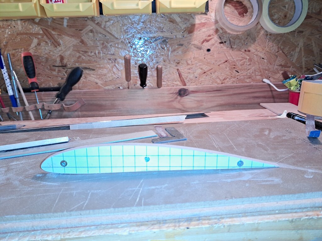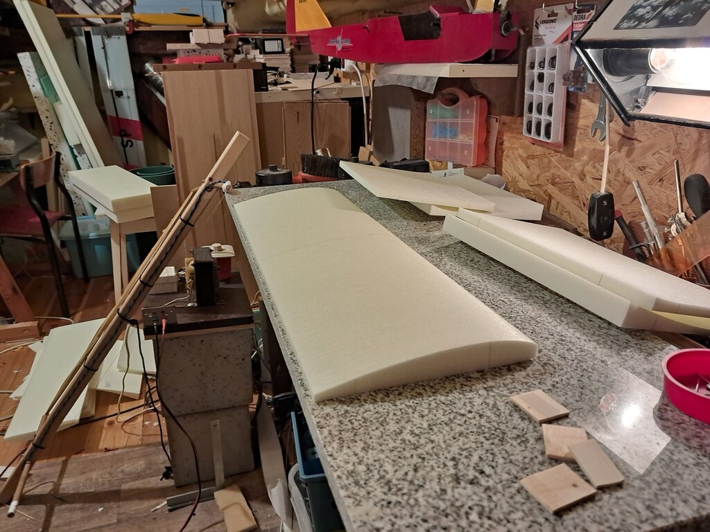 Witam , w tym sezonie niefortunnie uderzyłem w ziemię modelem mojego wysłużonego górnopłata El Easy . Po oględzinach na szczęście kadłub pozostał praktycznie nieuszkodzony ale skrzydło nie nadaje się już do naprawy więc postanowiłem na szybko dorobić proste skrzydło w technologi rdzeń styrodurowy oklejony folią samoprzylepną Oracal. Technika znana z kombatów ACES , jednak pomyślałem sobie ,że zrobię trochę zamieszania na forum i założę relację z budowy krok po kroku takiego skrzydełka : może komuś początkującemu się przyda a i będzie okazja do wymiany doświadczeń między bardziej doświadczonymi kolegami. Oczywiście można zamówić rdzeń wycięty na ploterze i mamy problem z głowy ale ja chcę pokazać jak można bardzo prostymi narzędziami zbudować od podstaw skrzydło. Celowo płat nie posiada pokrycia balsowego ponieważ model jest już dość stary i przez 15 lat latał ze skrzydłem styropianowym krytym folią! ( wiem wiem to była lekka przesada ale wtedy nie wiedziałem o tym) nie ma sensu komplikować konstrukcji i podnosić ceny. Zamysł jest taki aby wykonać skrzydła możliwie szybko i tanio a potem cieszyć się fajnie latającym modelem i mieć fun z tego ,że prościutkim modelem można też fajnie latać i trenować pilotaż. Mój płat to koszt 20zł płyta styroduru i do tego folia za 30zł . No i oczywiście serwa ale to się nie liczy do kosztów budowy. Relację zrobię krok po kroku aby ktoś kto chce spróbować ciąć rdzenie samemu a nigdy tego nie robił mógł się częściowo wzorować . Zdaję sobie sprawę ,że można to zrobić inaczej/lepiej i dlatego proszę traktować relację jak relację a nie przedstawienie ściśle technologii wykonania. A więc najpierw trzeba przygotować szablony ze sklejko 2-3mm 2szt. Ja proste kształty wycinam z szablonów pozytywowych Następnie tnę styrodur w bloki/kostki o wymiarach pomniejszonych o grubość krawędzi natarcia i spływu ale przewiduję około 3mm na obcięcie po wycięciu rdzenia. Robię tak aby nie było ewentualnych nadtopów materiału. Szablony mocuję na Uhu Por i dodatkowo 4 - 5 długimi gwoździkami . Tnę najpierw spód a potem górę z tym ,że przy cięciu spodu kładę blok "do góry nogami" aby mi było łatwiej. Tnę pod obciążeniem tzn. kładę coś ciężkiego na blok aby go dobrze docisnąć do deski. Posuw nadaję ręcznie z tym ,że ramę wieszam na sznurku co bardzo pomaga w cięciu. Negatywy po wycięciu pozostawiamy : będą jeszcze potrzebne. Wszystko trzeba robić ostrożnie i podczas obracania bloku uważać aby się nic nie przesunęło. Rdzenie tnę max. 50cm długości. Jak chcę więcej to robię 2 rdzenie i sklejam w połowie. Zaznaczam ,że tnę sam : w dwie osoby spokojnie można ciąć większe rdzenie bo wtedy kontrolujemy tylko jedną stronę . Moje skrzydło ma 1200mm rozpiętości czyli połówka ma 60cm więc dla ułatwienia sobie pracy zrobiłem dwa rdzenie na połówkę i skleiłem w całość. Jutro opiszę jak wykonuję krawędzie natarcia i spływu i rowek na dźwigar. Wrzucam kila zdjęć jak to wygląda obecnie :