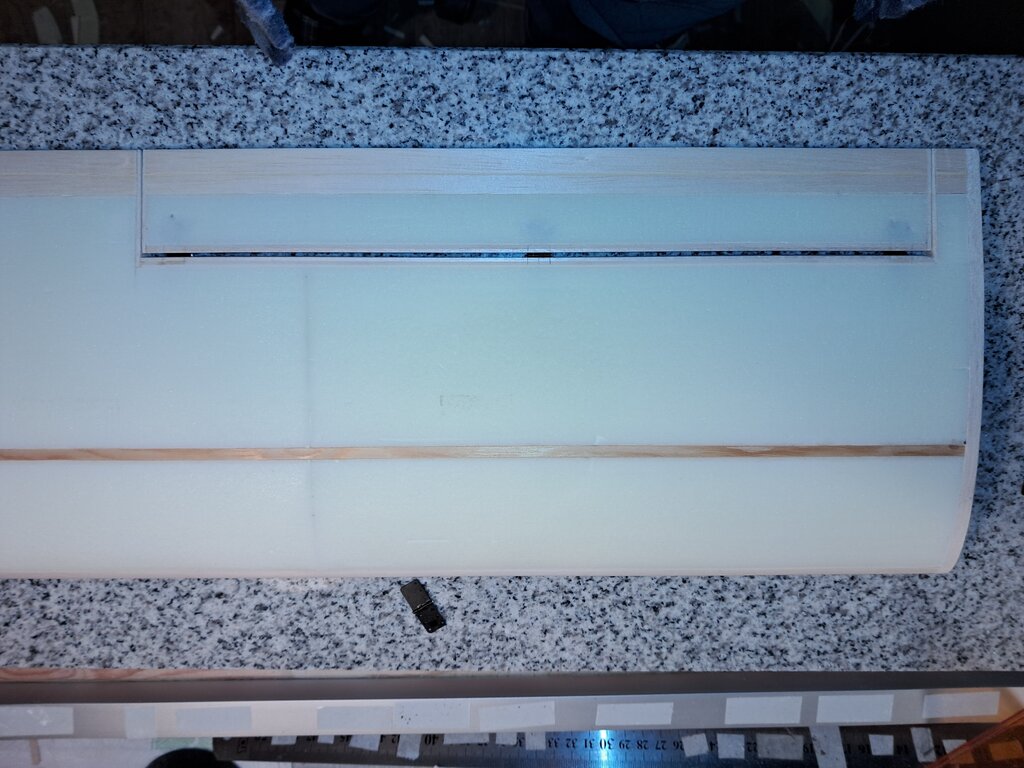 Kolejna praca to wykonanie rowka na dźwigar. Ja od dawna nie robię tego gorącym drutem tylko do listewki sosnowej naklejam papier ścierny tak aby sumaryczna grubość listewki i papieru ściernego była taka jak grubość listwy dźwigara. Takim "szuradełkiem" szlifuję przy linijce rowek co można zrobić bardzo precyzyjnie i szybko. Następnie doklejam krawędzie natarcia i spływu. Natarcie szlifuję najpierw zgrubnie w trapez a potem zaokrąglam papierem ściernym. Dokładne wykończenie robię "pilniczkiem "zrobionym z papieru ściernego na nosku profilu: nosek bardzo ładnie wychodzi choć wadą tej metody jest możliwość jej stosowania tylko do płatów o obrysie prostokątnym. Trzeba pamiętać o zabezpieczeniu powierzchni płata tuż za krawędzią taśmą pakową aby nie uszkodzić podczas szlifowania powierzchni płata. Spływ szlifuję do krawędzi stołu dopiero po przyklejeniu. Do klejenia używam żywicy i Poxipolu bo Soudal pomimo swoich zalet puchnąc powoduje czasem deformację elementów. Jutro opiszę odcinanie lotek. Kolejne dni niestety nie pozwolą mi już na codzienne majsterkowanie i dalsze prace przy skrzydełku będę umieszczał mniej regularnie . Reszta czynności jest już stosunkowo prosta ale mimo wszystko opiszę kolejne czynności do końca prac.