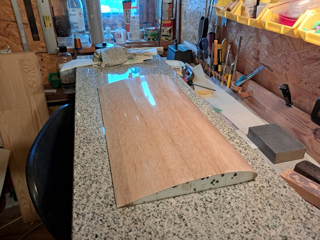 Dziś wolne to działam na modelarni. Przygotowania do świąt trwają ale zostałem wygoniony z kuchni abym nie przeszkadzał to tylko dobrze, można na modelarni posiedzieć🙂 Płat został oklejony folią Oracal ale najpierw jak już pisałem powyżej wykończyłem wcięcia na lotki folią w rolce. Narożniki po oklejeniu przeprasowałem żelazkiem temp. ok. 100st. Powyżej folia się topi a nie kurczy. Generalnie nawet przy tej stówie nie bardzo się kurczy ale taki jej urok. Jest też ciężka. Ale efekt moim zdaniem jest bardzo dobry i uważam ,że jest to świetny materiał pokryciowy do modeli rekreacyjnych albo budowanych w klubach przez młodzież ( o ile jeszcze w ogóle takie koła zainteresowań istnieją). Po zakończeniu pracy ręcznikiem papierowym złożonym w kostkę docisnąłem folię do płata kładąc go na równej desce. Wszystkie prace robiłem w rękawiczkach aby nie zatłuścić niczego Zbliżając się do końca relacji chciałbym wspomnieć ,że tego typu konstrukcje są dostępne praktycznie dla każdego i jeśli tylko mamy jakiś kąt do majsterkowania można spokojnie budować bo jest to konstrukcja dość prosta , tania i szybka w budowie. Jest to alternatywa dla gotowców z Epp gdzie płacimy mnóstwo kasy za kilka wyciętych na ploterze kawałków pianki.... Jestem zdania ,że jak już kupować to coś czego nie można wykonać samemu. Efekt po oklejeniu oceńcie sami oglądając fotki. Serwa zamówione , powinny przyjść jutro lub pojutrze. Po świętach płat będzie gotowy. Mam w planach zbudować kiedyś samolot który będzie miał kadłub wykonany ze styroduru i takie płaty , ale to już raczej elektryk będzie. Pewnie też zrobię relacje i będę Wam tu marudził na forum swoje modelarskie filozofie 😉 Aha ,może jeszcze dziś skrzydło dostanie jakiś ładny ozdobny pasek i napis.