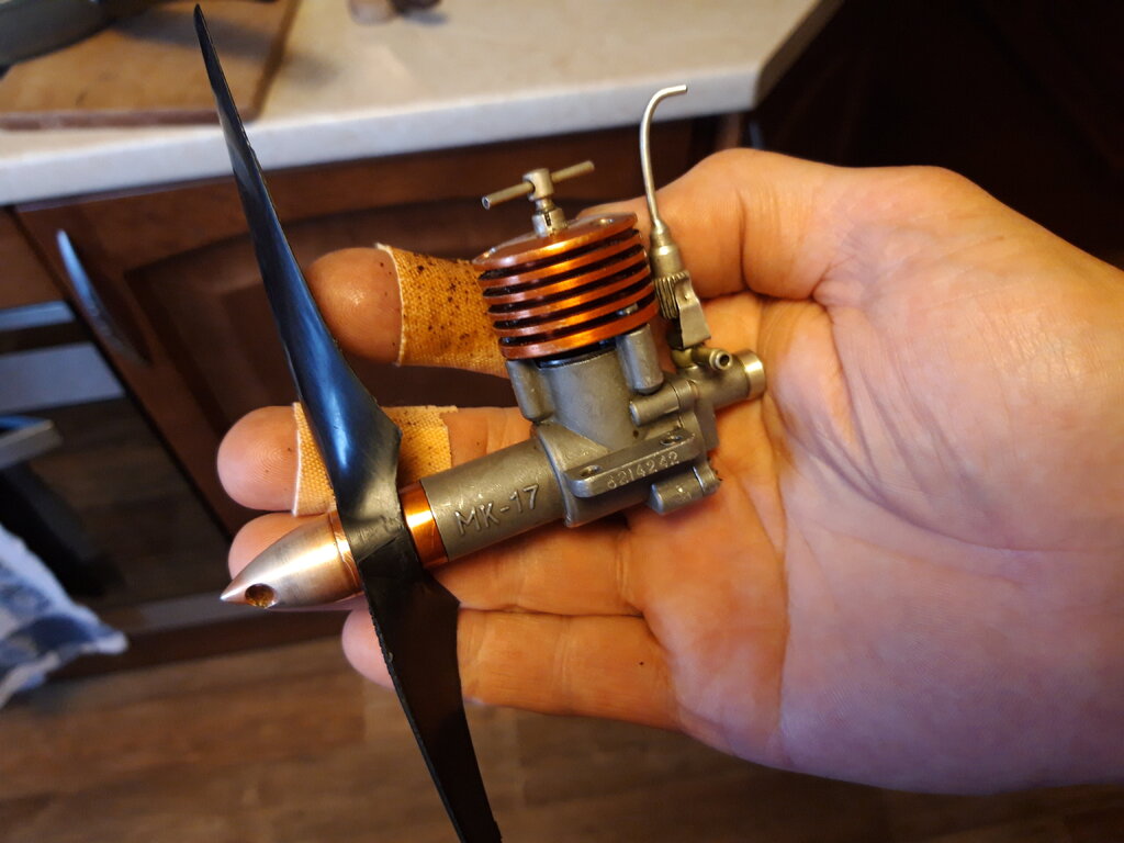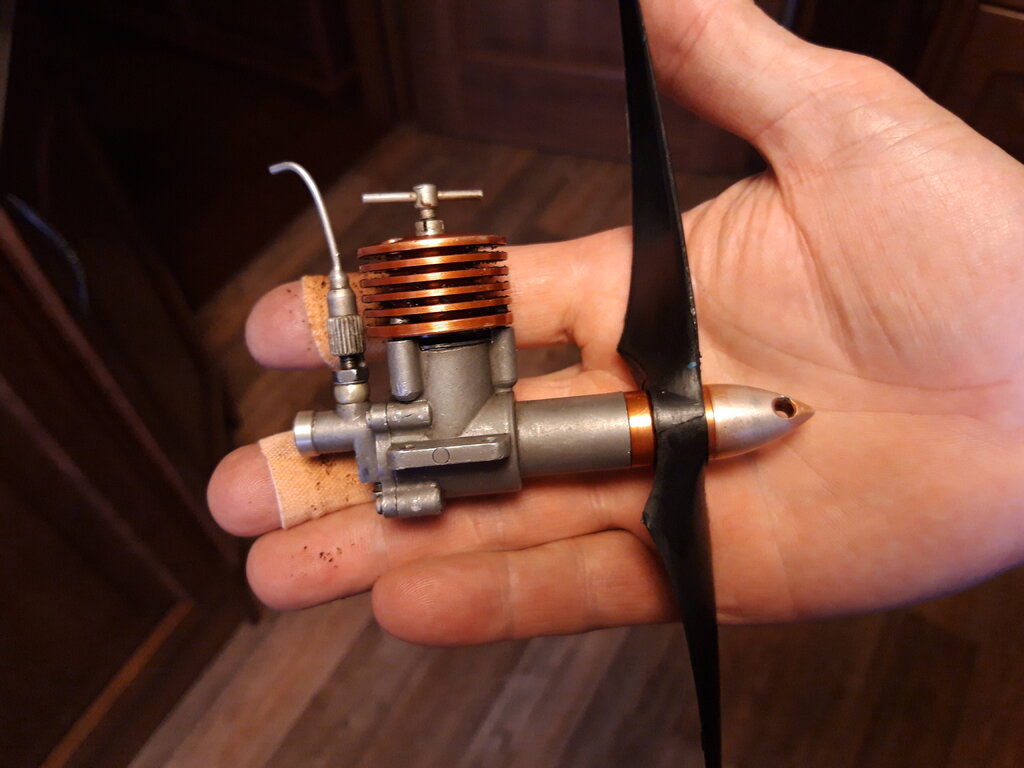 No i ruszył! Znalazłem nawet jakieś śmigło z epoki nie za bardzo zgodne ze skokiem i średnicą którą mi koledzy proponowaliście, ale daje radę. Początki były trudne, pojedyncze wybuchy albo praca silnika w przód i w tył w przód i w tył (takie odbicia) . Kiedy skończyły mi się już zdrowe palce złapałem za rozrusznik i voilà https://youtu.be/CKGw0_sZ1Lc Usłyszałem dźwięk Diesla, poczułem zapach eteru, doświadczyłem bólu palców i ... dziękuję. Gdyby ktoś chciał tego potwora to proszę pisać.