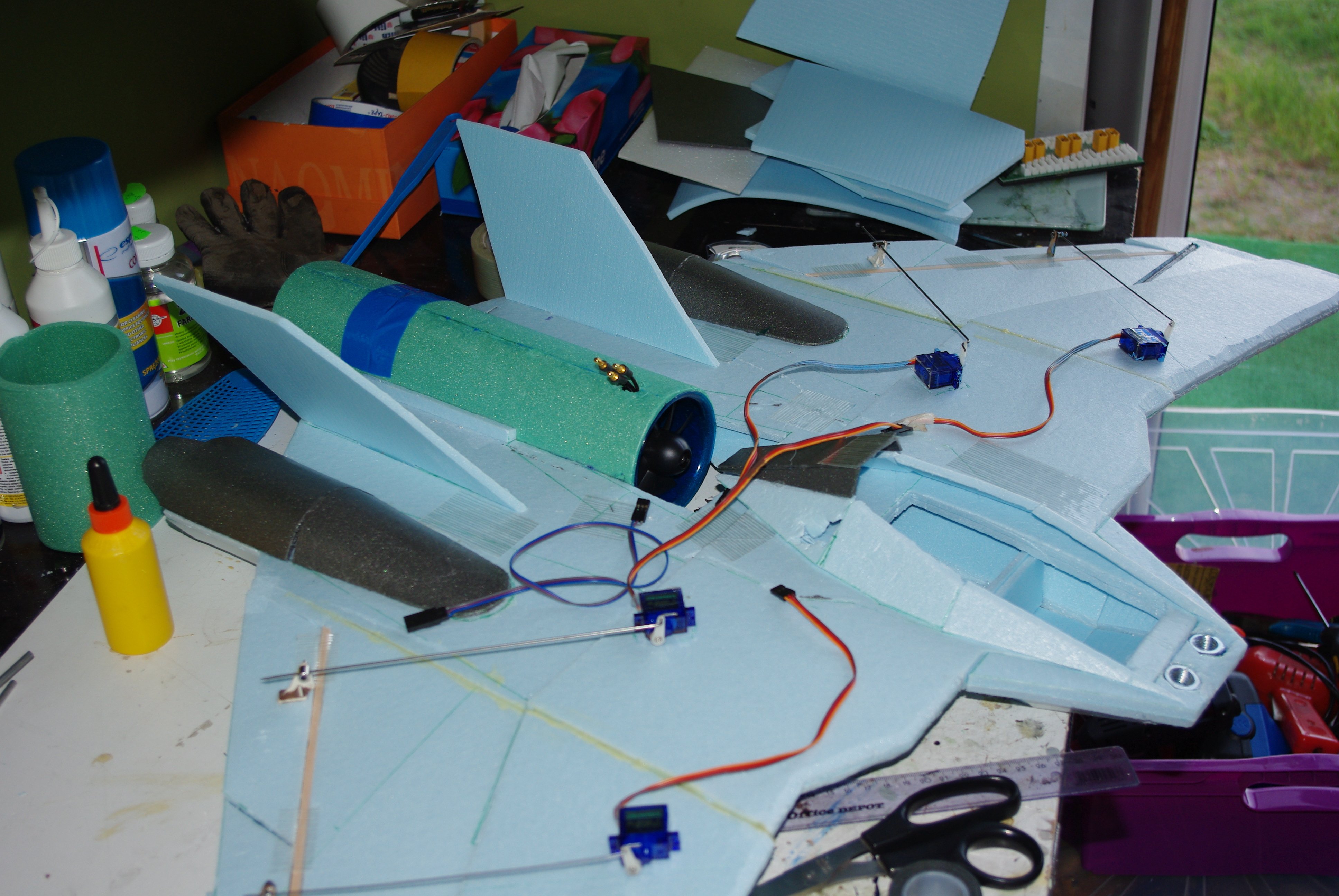 Zaległe zdjęcia. Gotowy do lotu Jak widać, aby go wyważyć w miejscu, dla którego dobrze szybował musiałem wkleić na dziób dwie spore nakrętki i dokleić druty na końcach skrzydeł. Przedłużyłem też dziób o 2cm względem pierwotnego planu. Tak wyglądał przed oblotem, dzisiejszego ranka. Zdjęć po oblocie nie mam. Samolot roztrzaskał się w drobny mak, ale tak szczęśliwie, że dało się go bardzo ładnie skleić. Tak wyglądał po paru chwilach odbudowywania. Nadbudówkę ściągnąłem do następnych oblotów Postanowiłem też rozdzielić sterowanie na klasyczny ster wysokości i lotki. -
