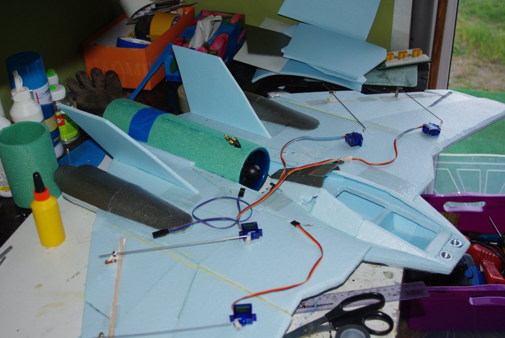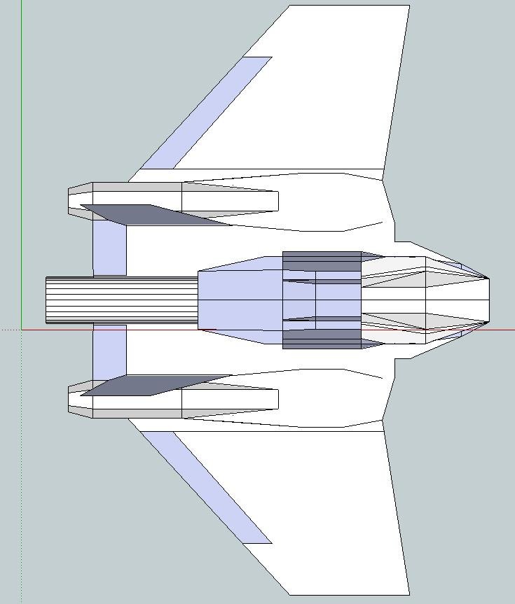Wprowadziłem zmiany w projekcie: - wydłużyłem kadłub, zwiększyłem cięciwę skrzydła, - wydłużyłem część nosową, do wyważania - wyprostowałem krawędź spływu przy głównym silniku. Przed zmianą Ciemniejszym kolorem zaznaczyłem powierzchnie sterowe po zmianie -