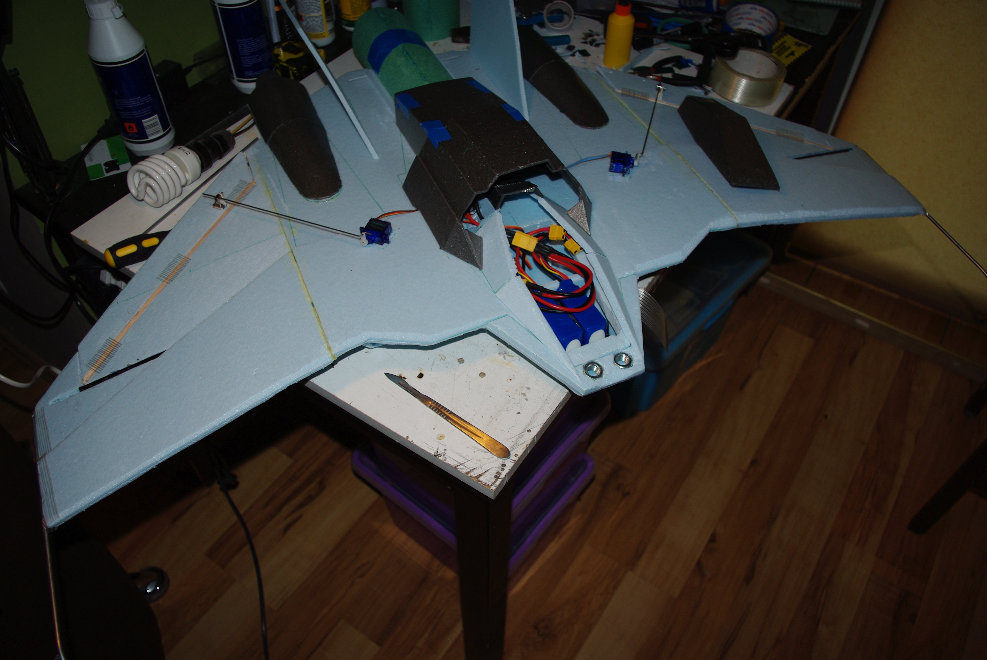 Dzisiaj druga próba oblotu. Przesunąłem też środek ciężkości o 1 cm do tyłu. Lot zakończył się spektakularną kraksą. Tym razem już nie nadawał się do sklejenia. To, że poleci takie skrzydło nie ulega wątpliwości, widziałem na yt. Niestety nie znalazłem informacji na temat jego konfiguracji. Czas budować drugi prototyp. Tym razem zrobię go na śmigło, będzie lżejszy. -