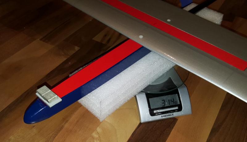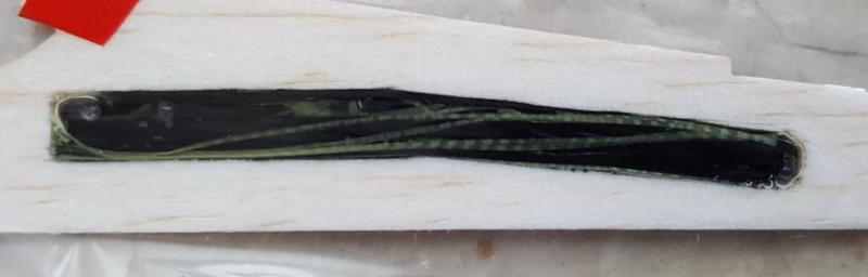 Łącznik jest wycięty z 2mm laminatu szklanego, szerokość 5-6mm długość ok 80mm, wycięty zgodnie ze wzniosem. Ponieważ nie mam takiego laminatu, a nie mam ochoty czekać na dostawę, to zrobiłem "formę jednorazową" z balsy 2mm i cienkiej folii i wypełniłem odpowiedniej długości (i krótszymi) kawałkami nitek szklanych, węglowych i kevlarowych (więcej rodzajów nie miałem pod ręką...), przekraplając żywicą do laminowania (tą 100:40 od Czechów) i ścisnąłem między dwoma metalowymi płytkami. Będę miał swój pierwszy laminat z formy Dokładne wyposażenie (w skrócie wyżej): - serwa Dymond D47, - aku 900mAh 1s cylinder Nanotech + voltage booster 2A z HK, - odbiornik Frsky V8R4 II (do Taranisa), W dziobie jest w tej chwili 20g balastu, więc model waży do lotu ok 310g