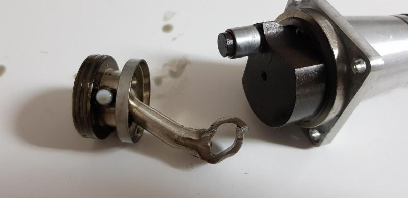 Parę dni temu spotkała mnie niespodziewana awaria motorka. Lecąc modelem rc z pełna mocą , silnik nagle lekko osłabł i po kilku sekundach gwałtownie zgasł. Po wylądowaniu śmigło było odkręcone, co już zapowiadało problemy. Wałem już nie szło obrócić dookoła, czuć było metaliczny opór. Po rozebraniu silniczka ukazał się taki widok. Na czopie została brązowa tulejka, czop nie przytarty. Jaka może być przyczyna? korbowód wygląda na wykonany solidnie i ma pewno ze 30 lat.