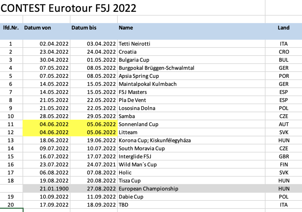 Zapisy na zawody World Cup i Eurotour w Łososinie Dolnej otwarte: www.rc-szczecin.pl Uaktualniony kalendarz eurotouru poniżej (dodane zawody w Szwajcarii).20220228_CONTEST Kalenderplanung F5J 2022_V02.xlsx