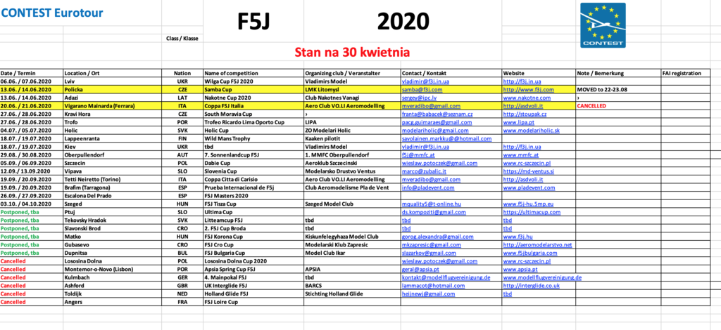 Plany Eurotour według najświeższych danych: (na dole plik excela - nie wiem czemu screenshot jest nieostry) CONTEST Kalenderplanung F5J_20200426.xlsx