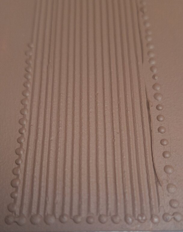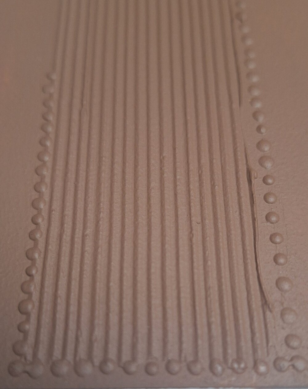 Imitacja poszycia "11" Oczywiście nity za duże ( muszę kupić cieńszą igłę) i za gęsto, ale to tylko próbka i to w powiększeniu. Rozstaw i wielkość fal ok. 0.8 mm. a nitów 1.5-2 mm. Nitowanie muszę poćwiczyć.