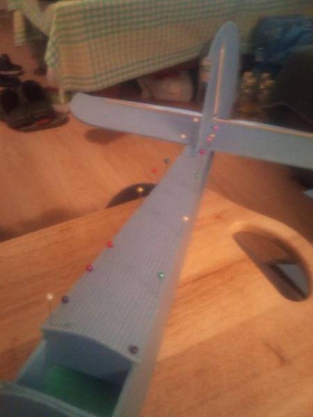 Prace ida do przodu,sa juz lotki i ma juz na czym stac samolocik,nogi i kapcie. caly w tym stanie wazy 105g. brak jeszcze serw i silnika,przy takiej wadze zakupie E-max 1806/25 micro serwa jakies a pakiecik powinien starczyc 2S 800mAh nie wiem tylko jeszcze co do smigla. i jeszcze jedno foto -
