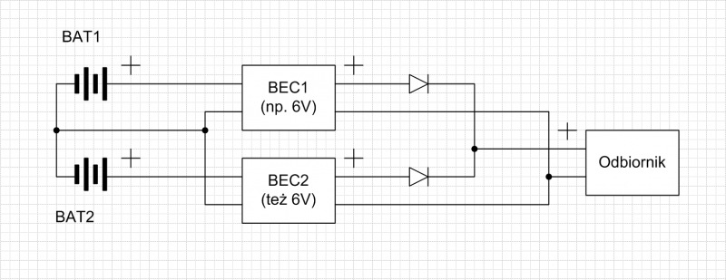 Przełącznik diodowy ma jedną wadę - zawsze przepuszcza wyższe napięcie. Powoduje to, że oba pakiety są rozładowywane, a nie - co jak się domyślam jest intencją autora - jeden pakiet jest "główny", a drugi "rezerwowy": Chyba, że diody włączysz za regulatorem napięcia, ale wtedy trzeba użyć dwóch regulatorów (BEC) o tym samym napięciu wyjściowym, a to kosztowne rozwiązanie. Przyznam się, że podobne dylematy doprowadziły mnie do projektu takiego awaryjnego przełącznika zasilania z wbudowanym regulatorem napięcia. Niestety, jeszcze nie jest gotowy... Bazuje na procesorze, ponieważ to bodaj najłatwiejszy sposób albo wyrównywanie napięcia pakietów, albo pracy w trybie przełączanego zasilania. Ceny takich urządzeń w sklepach modelarskich są koszmarne i uzasadnione jedynie 1000-procentową marżą . A odpowiadając na Twoje pytanie - można, ale pod warunkiem, którego nie jesteś w stanie zagwarantować, to znaczy - napięcie wyjściowe obu regulatorów musi być idealnie równe. Czasami wykonuje się takie połączenia, ale przez rezystory wyrównawcze, co w tym wypadku jest bez sensu (grzeją się, straty mocy itd.). Łatwiej włączyć na wyjściach obu regulatorów diodę Schottky (ma mały spadek napięcia w kierunku przewodzenia, a przez mało się grzeje i zapewnia wyższe napięcie na odbiorniku). Ze stratą rzędu 0,2-0,4V można się pogodzić. Załączam taki siermiężny schemat ilustrujący ideę dwóch BEC-ów.