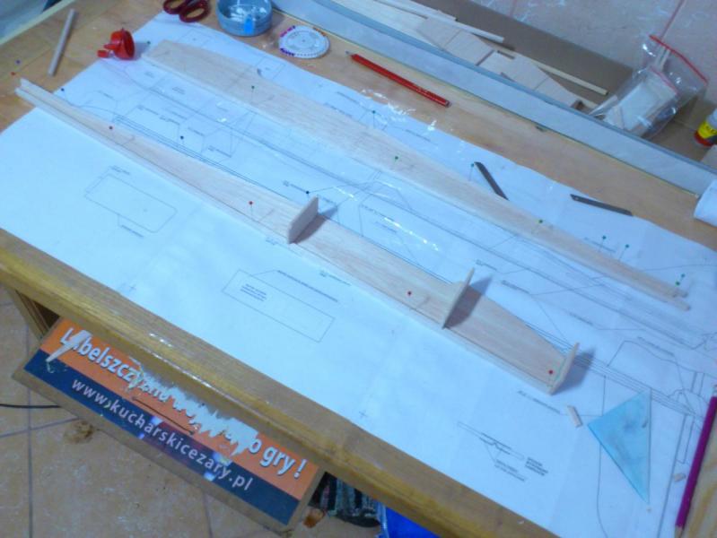 Witam ! kilka dni temu zakupiłem zestaw szybowca RC Pelikan Tu nasuwa sie moje pierwsze pytanie : ile taki zestaw kosztuje , uważam że lekko przeplaciłem czas na unboxing plany zostały sklejone : przeprowadzka do piwnicy troszke bałagan , ale ogarniam i zaczynam przyklejać listwy(podluznice*) do boków kadłuba juz z rozrysowanymi miejscami na wręgi: pojawia sie drugie pytanie , a mianowicie czy łoze skrzydła zrobic tak jak na planie, czy moze jednak wzmocnic je szerszym kawalkiem balsy (w oryginale jest to poprostu listewka balsowa 5x5mm) mam na mysli cos w stylu jak w toto0 lub toto1 wregi wklejone ! do wklejenia (nagięcia) listewek pod owiewkę musiałem je lekko naciąć ... mysle , ze nie osłabiłem tym konstrukcji dziobu* prace trwają ...