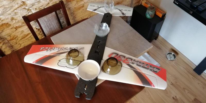 Dałem pakiet 900mAh 3s,usytuowałem go z lewej strony kadłuba pod skrzydłem patrząc od przodu modelu (na rzep).Z prawej strony mam regulator i odbiornik. U mnie sc wyszedł w/g instrukcji...tj. 250mm licząc od przodu kadłuba. Tak to wygląda u mnie. 1837_1_Extra_330_Aerobatics (2).pdf
