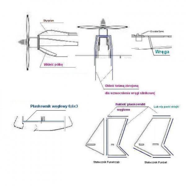 Nie To styropian, który miał upodobnić Funbata do jastrzębia. Wzięło się to stąd, że gdy kolega Darek pierwszy raz przywiózł swojego Funbata na lotnisko [z czarnym spodem] to ktoś stwierdził przy oblocie, że wygląda jak jastrząb. Tak było w istocie. Za tydzień przywiozłem swoją wersję przedłużoną (od końca lotek) do 110 cm i dałem mu nazwę FunStrząb. Lata cudownie i świetnie szybuje. Obecnie czeka na wykonanie nowego przodu kadłuba. Pianki tak mają, że po kilku przejściach "miękną" i kadłub stracił geometrię. To nie wiele roboty, a model tego wart. Wykonałem wtedy nawet rysunki zmian. Jeśli się komuś podoba to proszę: PS: nie mam w profilu przed imieniem "Pan"